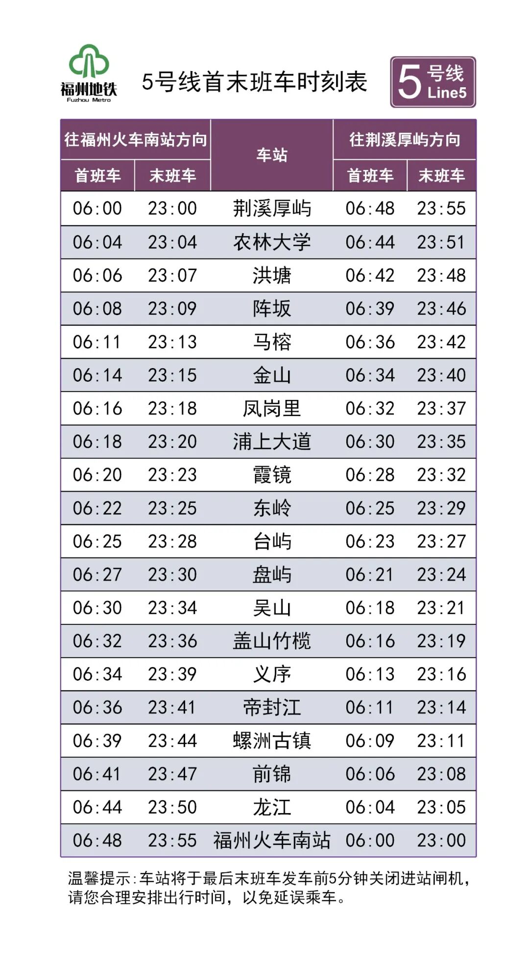 1.各线路具体站点的首末班车时刻,可通过车站公告或通过“福州地铁”官方网站及微信公众号查询。