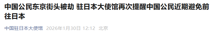 中国驻日本大使馆再次提醒中国公民近期避免前往日本,提醒已在日中国公民密切关注当地治安形势,提高安全防范意识,加强自我保护。如遇紧急情况,请及时报警并联系驻日使领馆寻求协助。