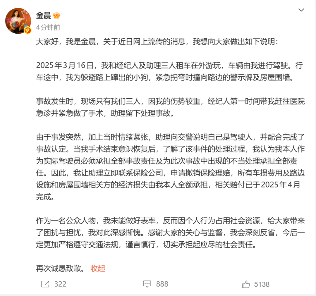 作为一名公众人物,我未能做好表率,反而因个人行为占用社会资源,给大家带来了困扰与担忧,我对此深感惭愧。感谢大家的关心与监督,我会深刻反省,今后一定更加严格遵守交通法规,谨言慎行,切实承担起应尽的社会责任。