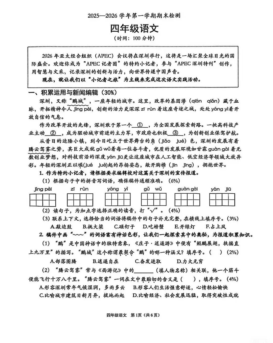 以网传南山区小学四年级语文考卷为例,从试卷本身来看,阅读量大,覆盖6页A4纸,出题人以2026年将在深圳举办的APEC会议为引,以“成为小记者,参与深圳特刊创作”为主题情境,设计了整套试卷。
