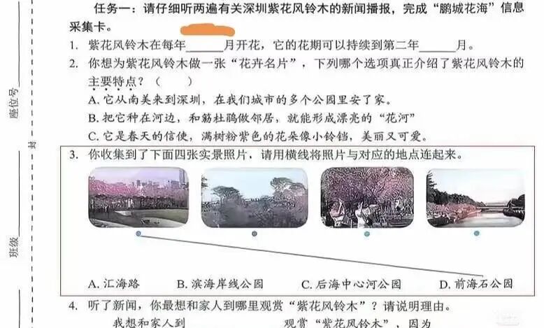 今年福田区小学四年级的一套语文期末试卷中的连线题在家长圈中讨论度也“炸锅”:该题目要求听两遍有关深圳紫花风铃木的新闻播报,将四张实景照片与对应的几个深圳公园地点连线。一名福田区的语文老师告诉红星新闻记者,抛开这道讨论度较高的听力连线题不谈,以前考试都是6面A4纸90分钟,这次是8面90分钟,她带的班里有14个学生没写完作文题。