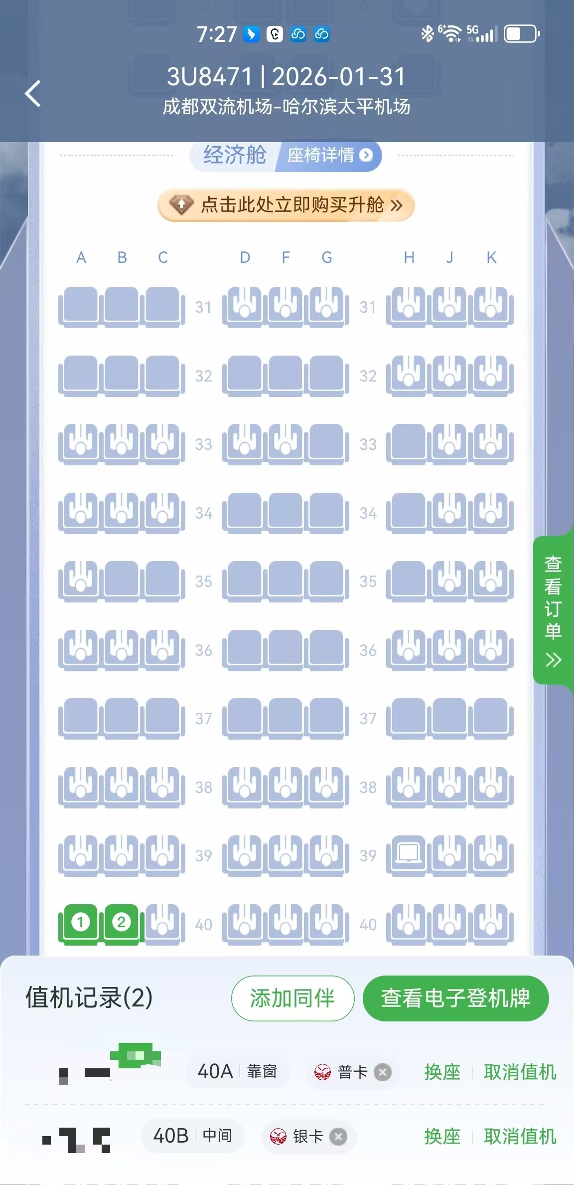 记者提前在川航官方App购买了1月31日成都至哈尔滨的直达航班,执飞机型为A321,座位数有65排、331个。值机开放后,记者第一时间在线选座,仅能选择40排及以后的座位,经济舱靠前区域大量座位呈灰色锁定状态,无法自主选择,需通过会员权益或里程兑换才能解锁。值得注意的是,距离飞行不足12小时,40排之前仍有部分座位处于空置状态,却未向普通旅客开放。