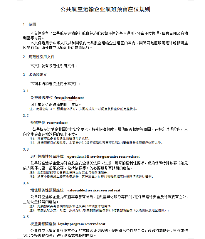 《公共航空运输企业航班预留座位规则(征求意见稿)》部分截图