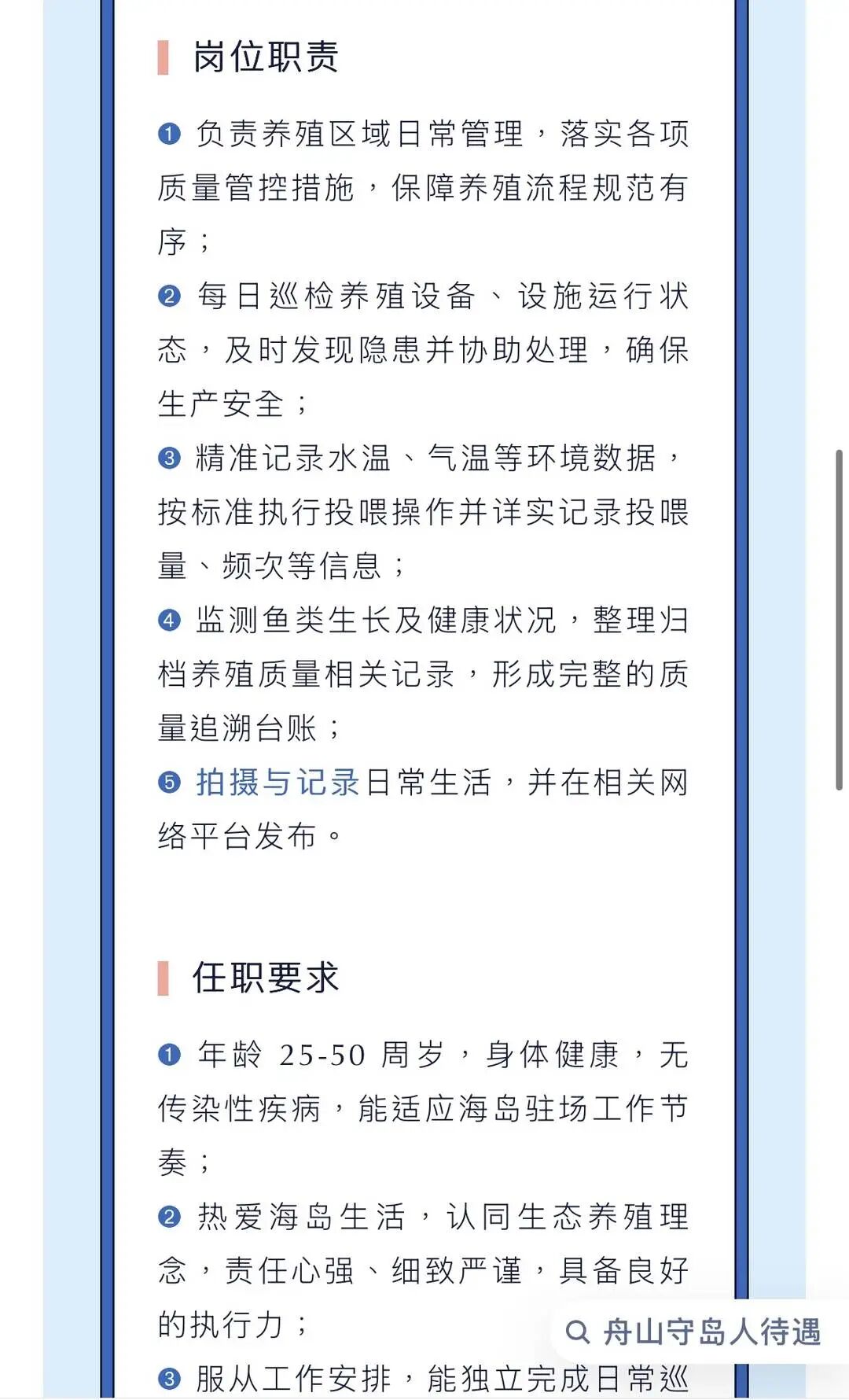 在这个招聘启事中注明,舟山岱山东寨岛大黄鱼围栏养殖基地坐落于风光旖旎的海岛之上,专注于深远海围栏生态鱼类养殖,现诚聘守岛人 2 名。要求负责养殖区域日常管理,每日巡检养殖设备、设施运行状态,精准记录水温、气温等环境数据,按标准执行投喂操作并详实记录投喂量、频次等信息;监测鱼类生长及健康状况,整理归档养殖质量相关记录,形成完整的质量追溯台账; 拍摄与记录日常生活,并在相关网络平台发布等等。