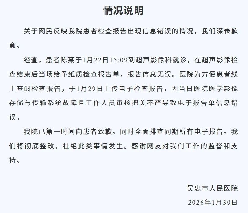 1月30日,吴忠市人民医院发布情况说明: