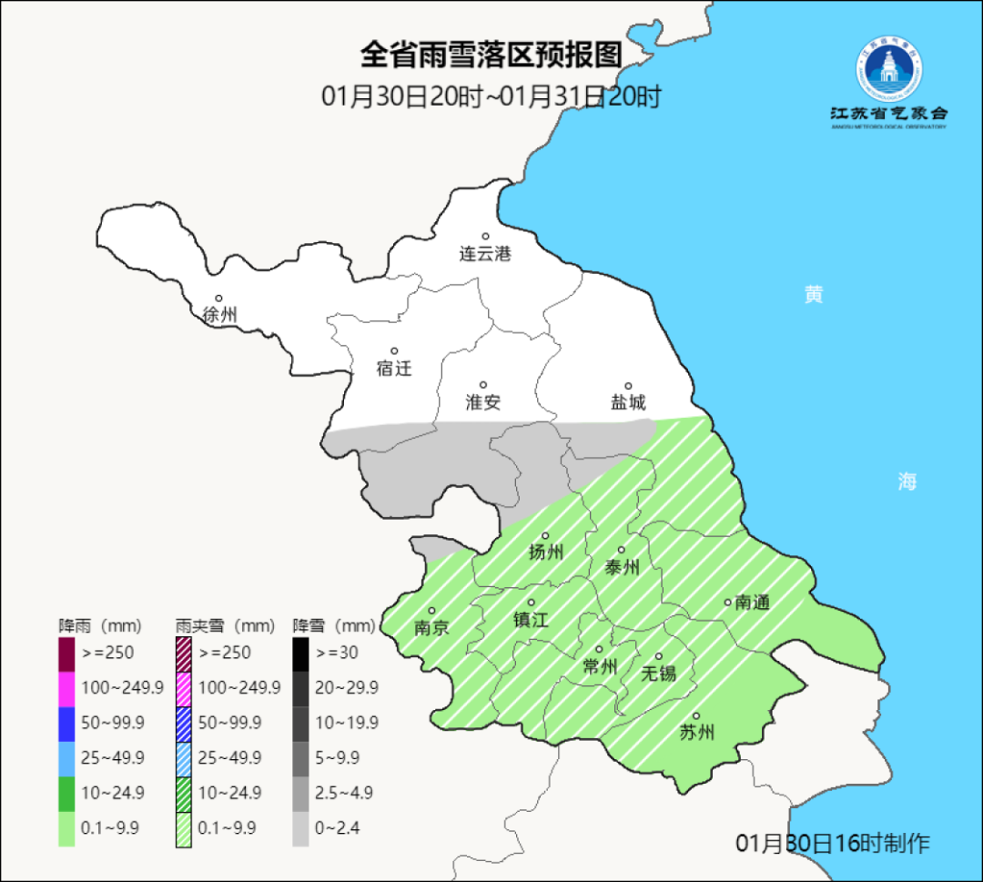 据@江苏气象 发布,1月30日20时至1月31日20时,今天夜里淮河以南阴有小雨夹雪或小雪,其他地区阴到多云;明天白天苏南南部地区阴有小雨或小雨夹雪并渐止转多云,其他地区阴转多云。最高温度:苏南地区5℃左右,其他地区6~7℃;最低温度:沿淮和淮北地区-2~-3℃,本省东南部地区2℃左右,其他地区0~1℃。全省东北风4-5级阵风6级转偏西风4级左右。