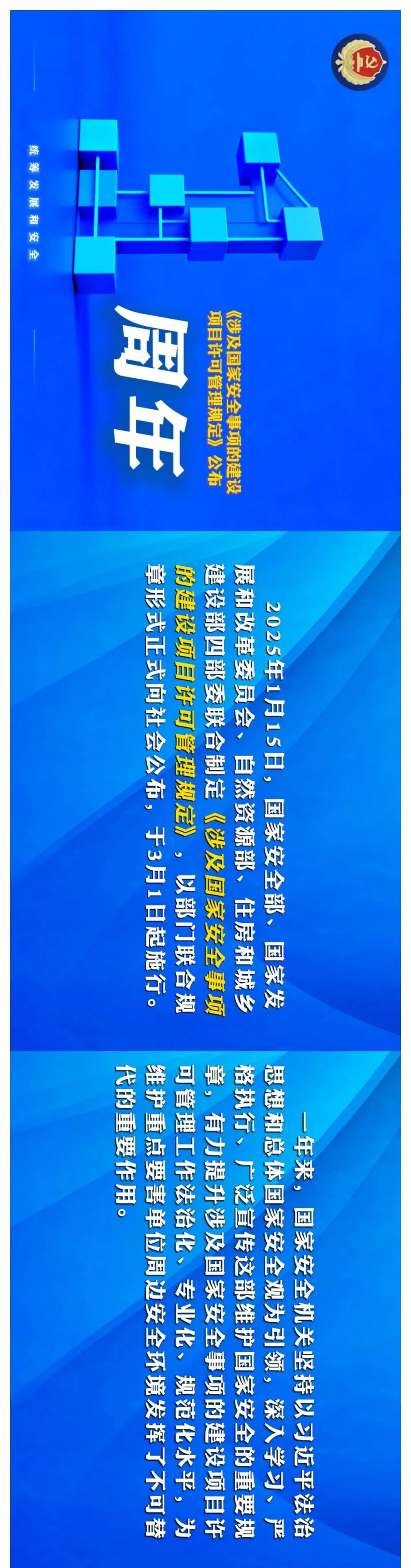 1月28日,据国家安全部:《涉及国家安全事项的建设项目许可管理规定》出台一年来,国家安全机关与有关部门协同发力,有效预防和化解重点要害单位周边风险隐患,有力维护了国家安全。