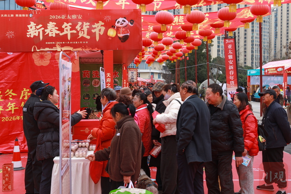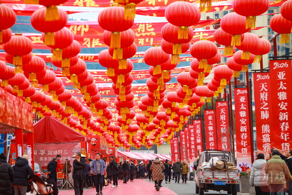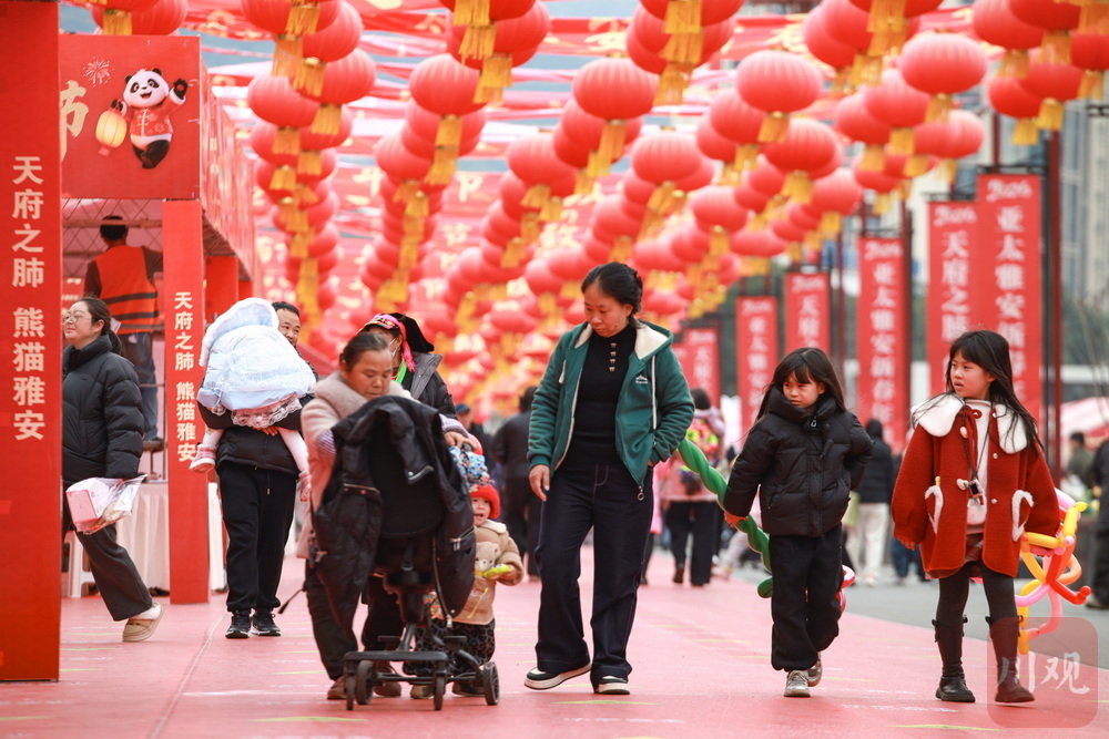 1月31日,雅安市雨城区熊猫绿岛文旅特色消费街区内,于日前开启的2026亚太雅安新春年货节现场张灯结彩、喜庆洋洋,充满了办年货赶大集的氛围感。