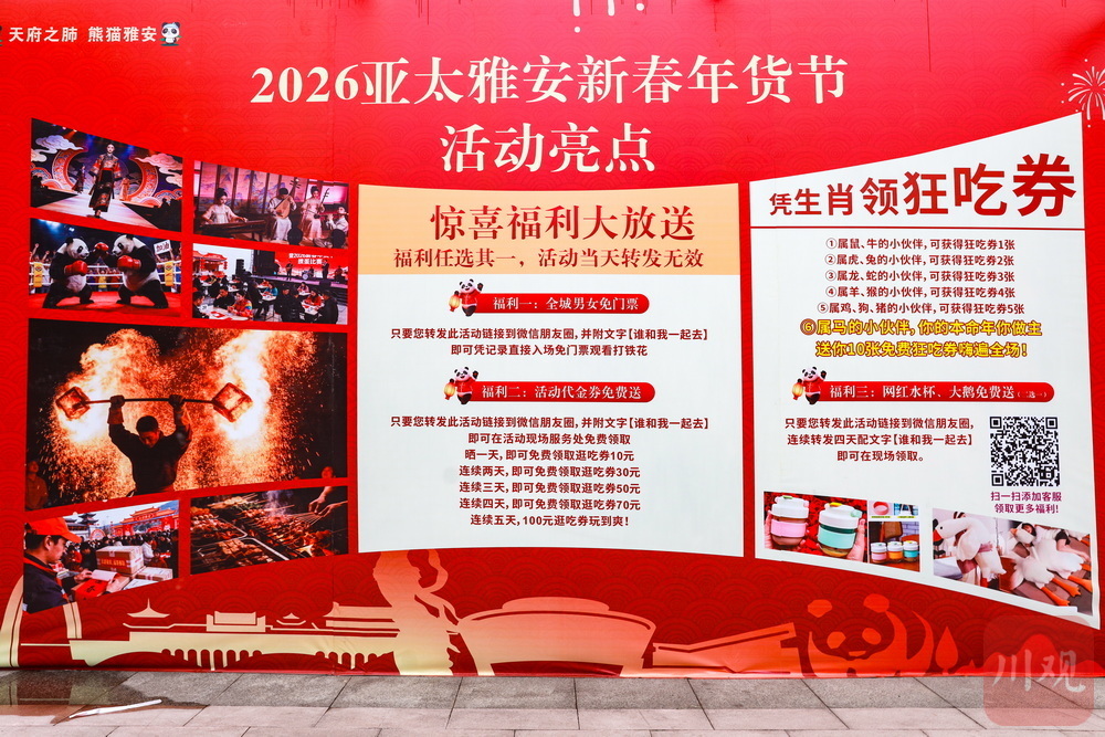 据了解,本次年货节为期12天。期间,将设定不同主题,内容涵盖非遗技艺展演(打铁花、火壶等)、美食文化体验、熊猫主题互动、茶文化品鉴、潮流音乐演出、全民趣味赛事等多个板块。并将举办非遗技艺现场展示、特色美食品鉴、大马戏等系列互动活动,同步推出消费券发放、商家促销等惠民措施。