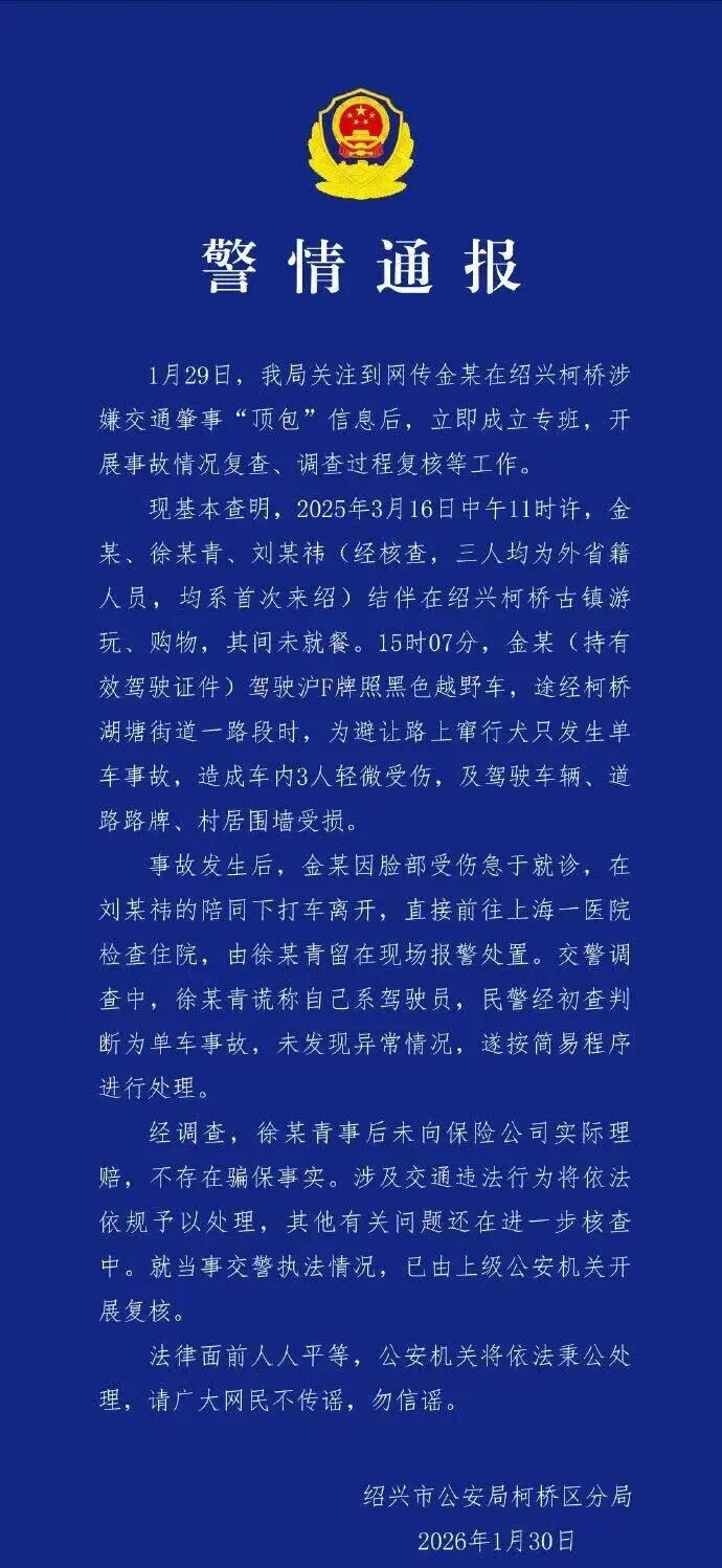 1月30日,绍兴市公安局柯桥区分局发布警情通报: