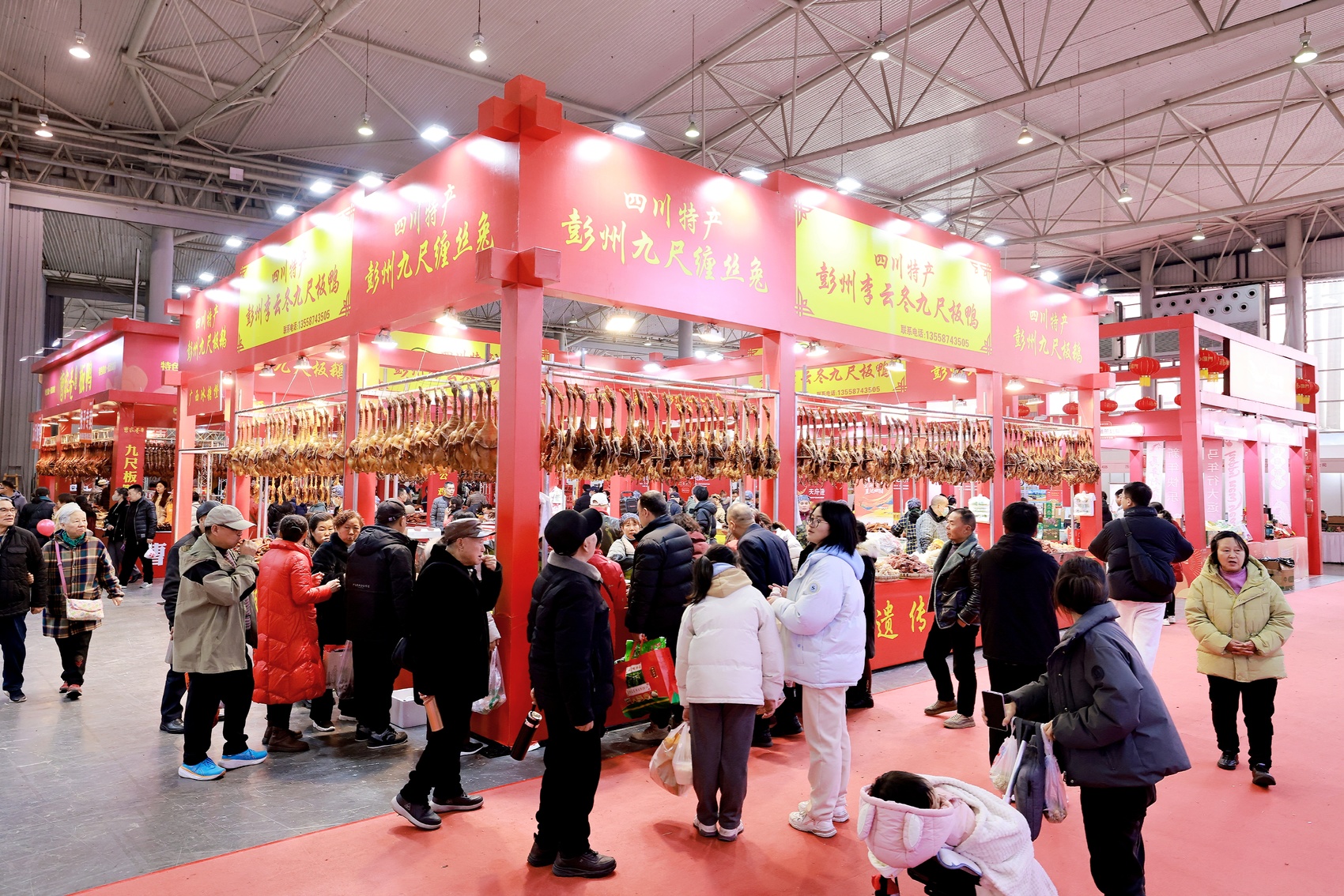 走进展馆,承载着巴蜀记忆的“川字号”优品区域人气十足。这里既有青神竹编、荣县陶艺等非遗文创,还飘散着耗子洞樟茶鸭、乐山甜皮鸭的诱人香气。“我们已经是第六次参加年货节了,老顾客都认我们家的品质,都是地道的四川风味。”在四川竹乡纯味食品有限公司的展位前,销售人员彭超一边向记者介绍,一边正麻利地为顾客切香肠、称五花肉。