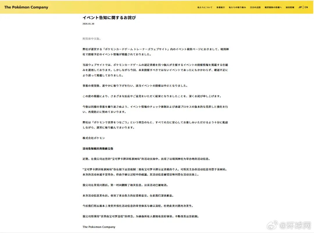 据环球网消息,1月30日,宝可梦公司发布双语公告: