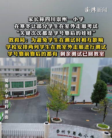 1月30日,崇州市教育局回应表示,1月26日,崇州市蜀南小学校三、四年级进行期末教学调研测试,为避免学生在测试时相互影响,学校安排两列学生在教室外走廊进行测试。在走廊进行调研测试的学生由各班自行安排,有些是学号靠前的,有些是学号靠后的,并不是所有学号靠后的学生都在走廊测试。