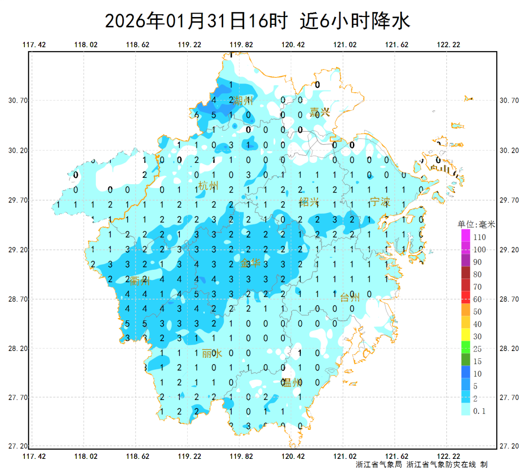山区下雪,平原下雨,昨天绝大多数的地区还是以下雨为主。雨淅淅沥沥下着,被湿冷的体感包围,不过总体量级不大,以小雨为主。16时,近6小时累计雨量最大出现在杭州余杭区百丈村,为9.6毫米。