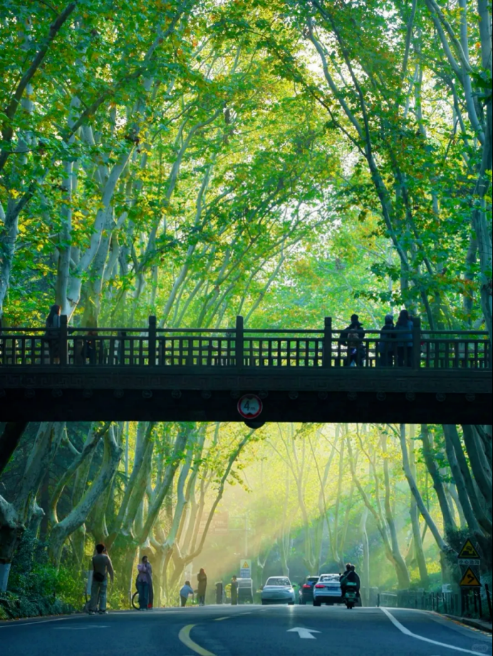 1929 年为迎接孙中山先生灵柩,这里种下数千株二球悬铃木,如今百年古树枝繁叶茂,交织成延绵数公里的天然 “绿色隧道”。阳光穿透层层枝叶洒下斑驳光影,脚下落叶轻响,身旁树干挺拔,历史厚重感与自然灵动感在此完美交融。
