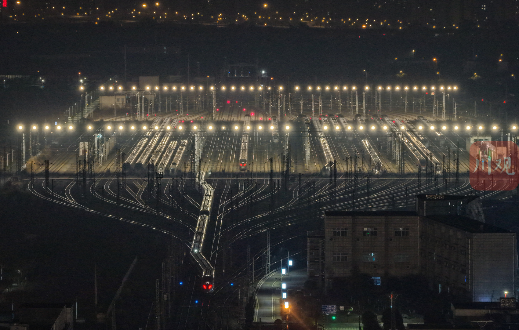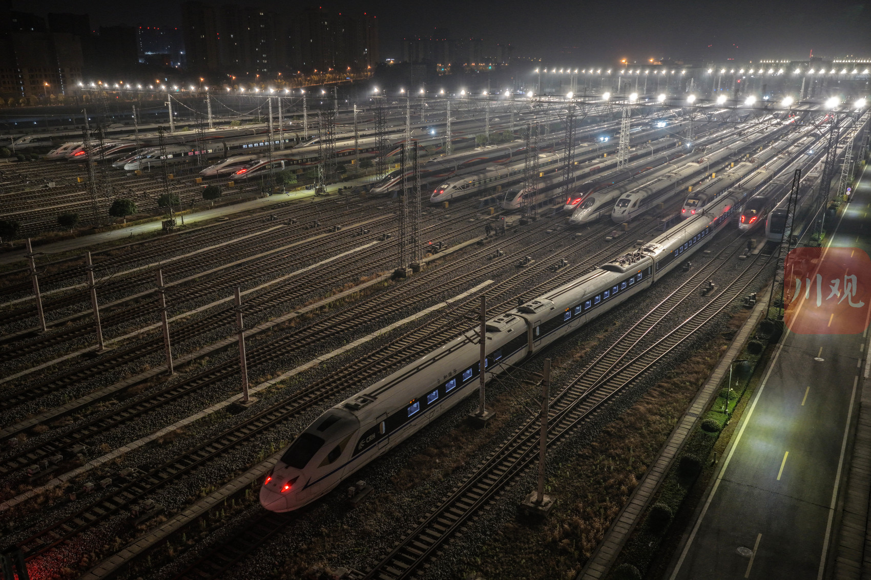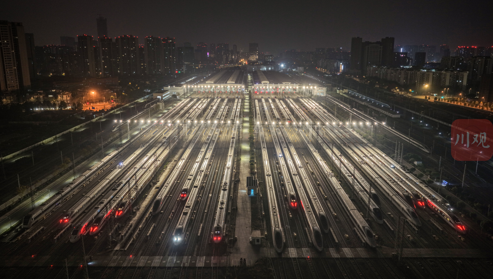 2026年2月1日凌晨,中国铁路成都局集团有限公司成都动车段的存车场内,一列列动车组整齐排列,宛如蓄势待发的“钢铁巨龙”。从高空俯瞰,这片钢铁方阵更似整装待发的“陆地航母”,正为次日(2月2日)开启的2026年春运大幕做最后准备。