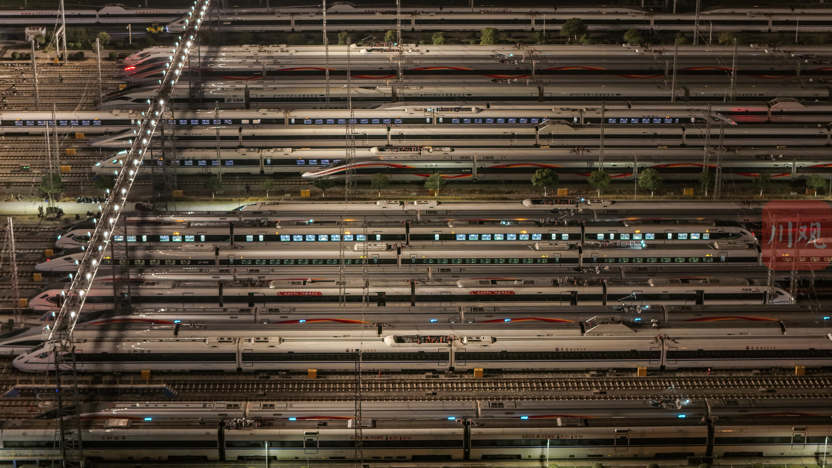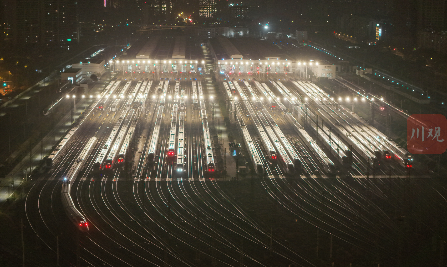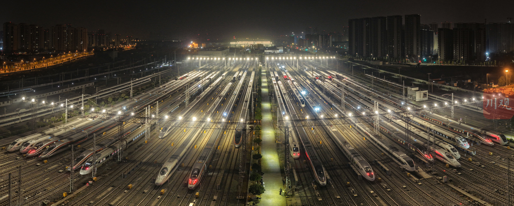 2026年2月1日凌晨,中国铁路成都局集团有限公司成都动车段的存车场内,一列列动车组整齐排列,宛如蓄势待发的“钢铁巨龙”。从高空俯瞰,这片钢铁方阵更似整装待发的“陆地航母”,正为次日(2月2日)开启的2026年春运大幕做最后准备。