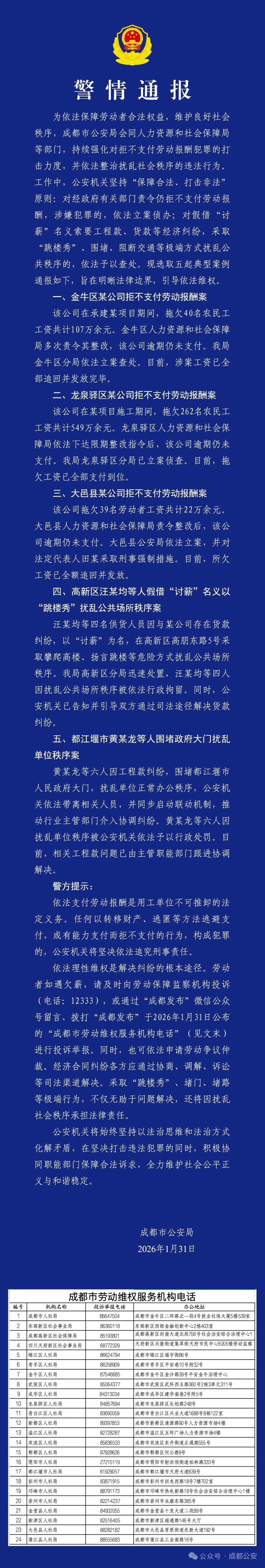 1月31日,成都市公安局通报五起涉欠薪领域典型案例,旨在明晰法律边界,引导依法维权,保障劳动者合法权益,维护良好社会秩序。