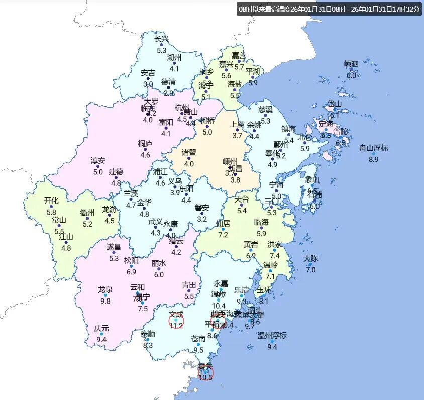 昨天全省大部地区都在10℃以下,而温州地区依旧被暖意包围。德清今天的最高气温仅2.9℃,“冻”手“冻”脚感明显;而文成的最高气温依旧维持在10℃以上,为11.2℃,两地温差达8.3℃。
