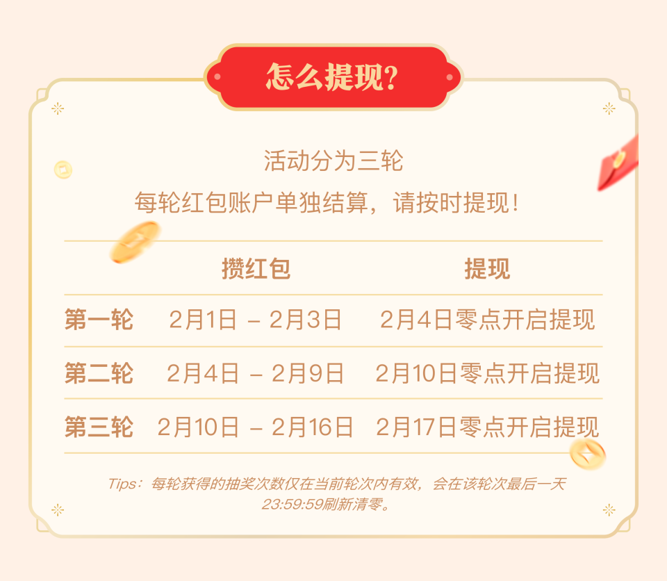 主会场活动分为3轮,2月4日零点、2月10日零点、2月17日零点后开启上一轮的红包现金提现。