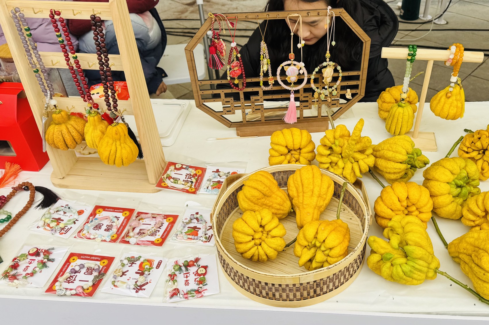 另一侧,四川忠孝农业开发有限公司负责人李艳正擦拭着一早从合江县白沙镇忠孝村带来的新鲜佛手,桌上还摆放着佛手挂件、佛手蜜饯、佛手桃酥、佛手茶等产品。她说:“鲜佛手散发的气味很香,所以还比较受欢迎,不少市民来询价购买。”