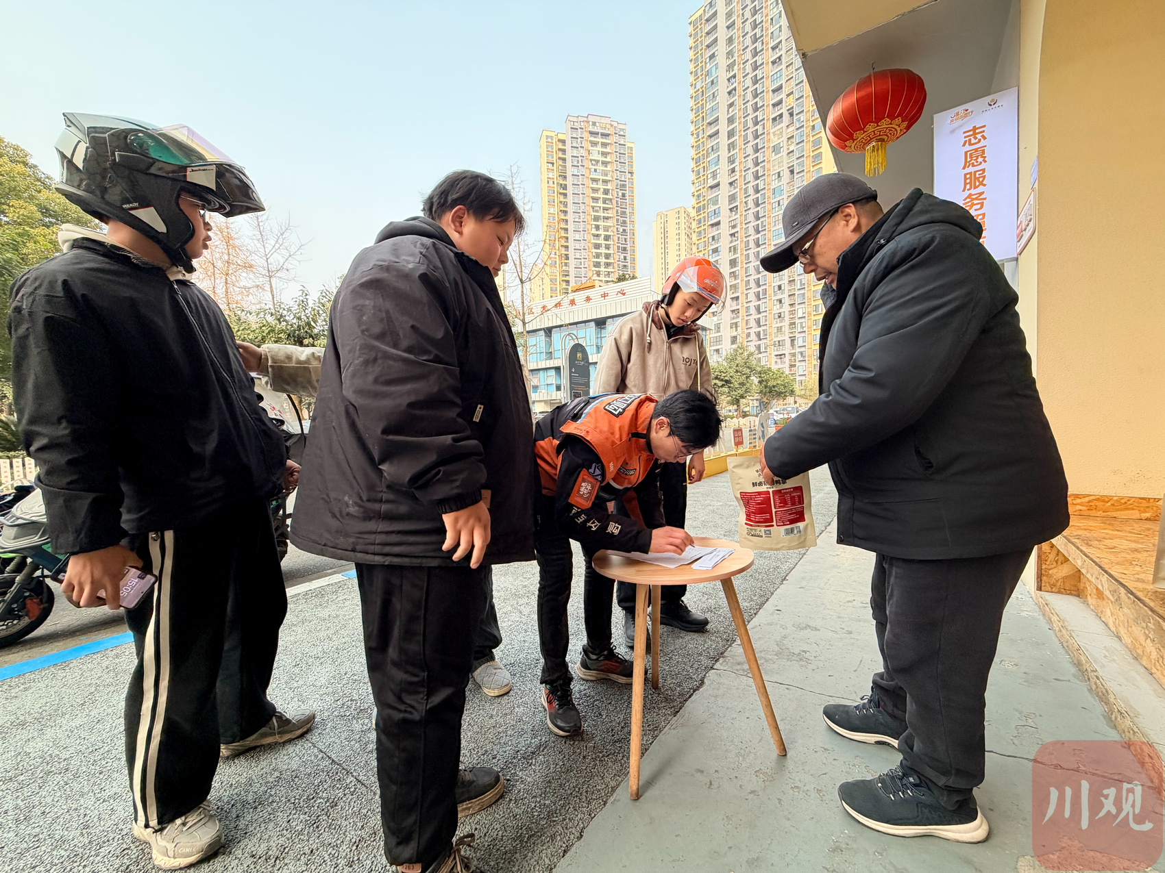 外卖员陈张在门口停下电瓶车,签字后免费领取了一袋鸭掌和一个苹果。“保质期还有一个月,抓紧吃哈。”肖静叮嘱。这是针对外卖员、环卫工等户外劳动者的定向关怀,往往是保存期短的食品,当日领取当日发完。