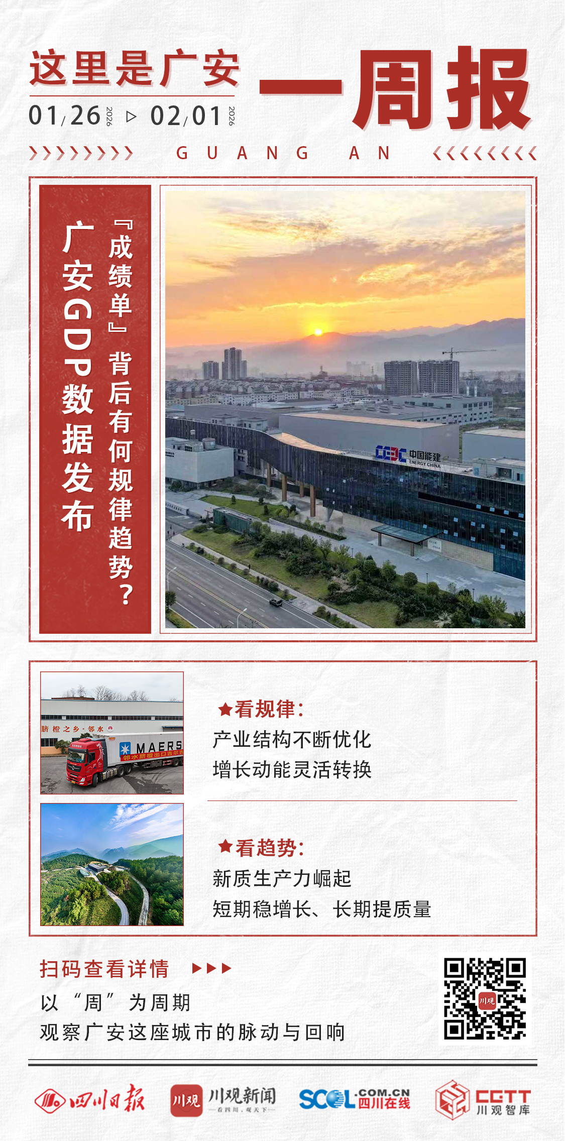 1月26日至2月1日,2026年的第5周。这周,广安市统计局公布2025年经济数据 “成绩单”:2025年,广安地区生产总值达1700.9亿元,同比增长5.7%。三大产业同步发力,第一产业增加值233.4亿元、增长3.8%;第二产业480.0亿元、增长5.3%;第三产业987.5亿元、增长6.3%。