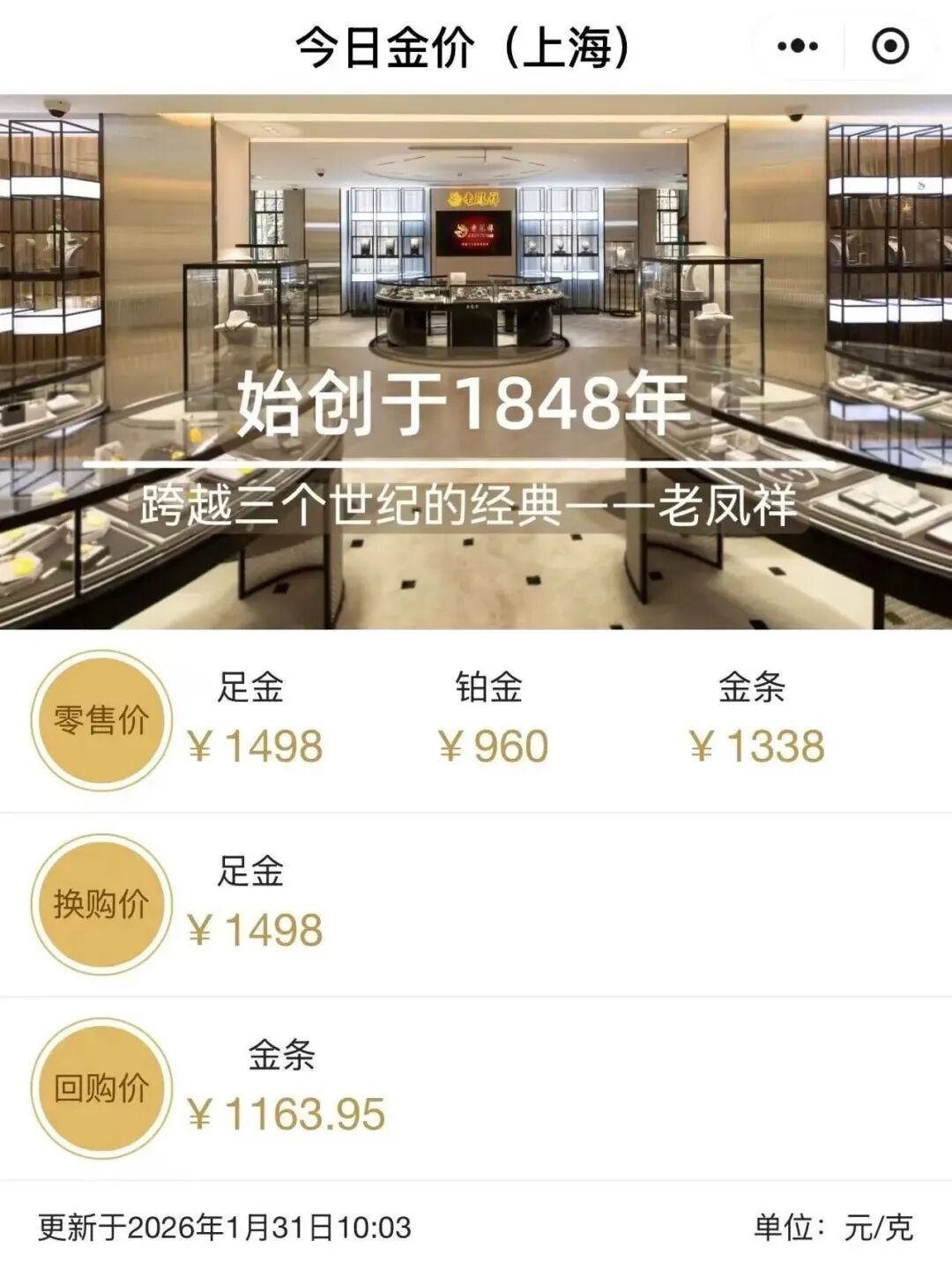 老凤祥上海会员中心小程序发布数据显示,今日足金饰品报1498元/克,该店于29日足金饰品报1713元/克,两日跌去215元/克。