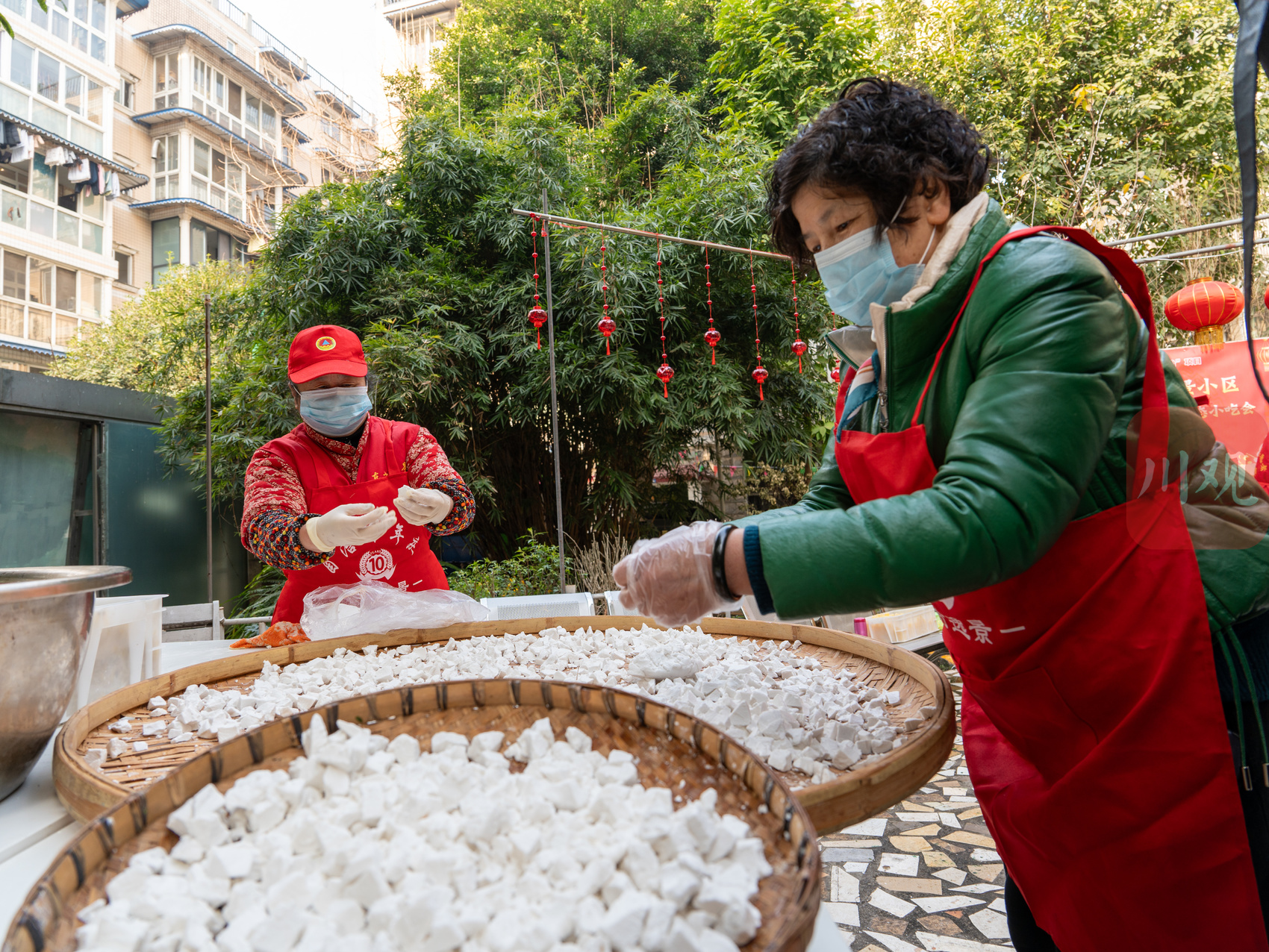 2月1日,小区居民在小吃会制作小吃。