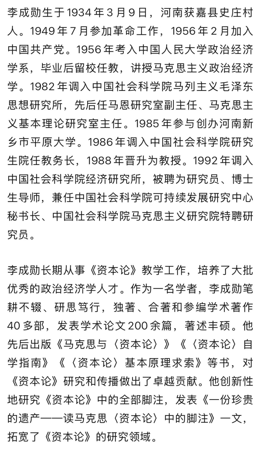 澎湃新闻记者从中国政治经济学学会方面获悉,中国社会科学院经济研究所研究员,新乡学院名誉校长,原中国社会科学院研究生院教务长、中国社会科学院可持续发展研究中心秘书长李成勋教授,因病医治无效,于2026年1月30日凌晨3时14分于北京逝世,享年92岁。
