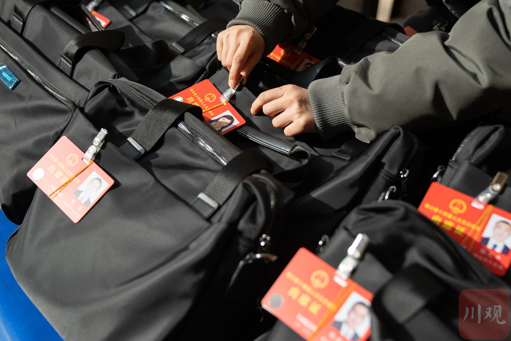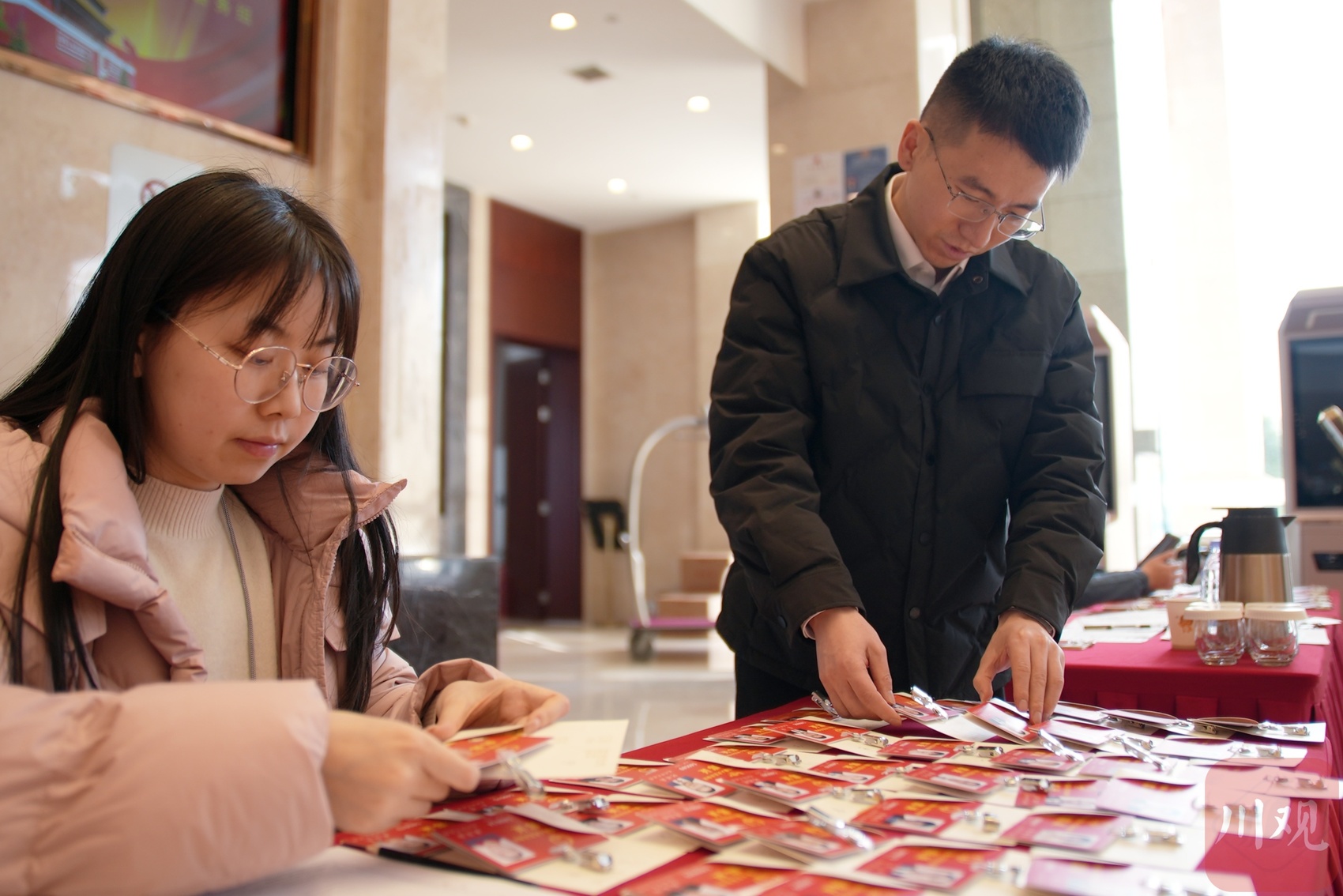 工作人员正在整理证件与资料包。