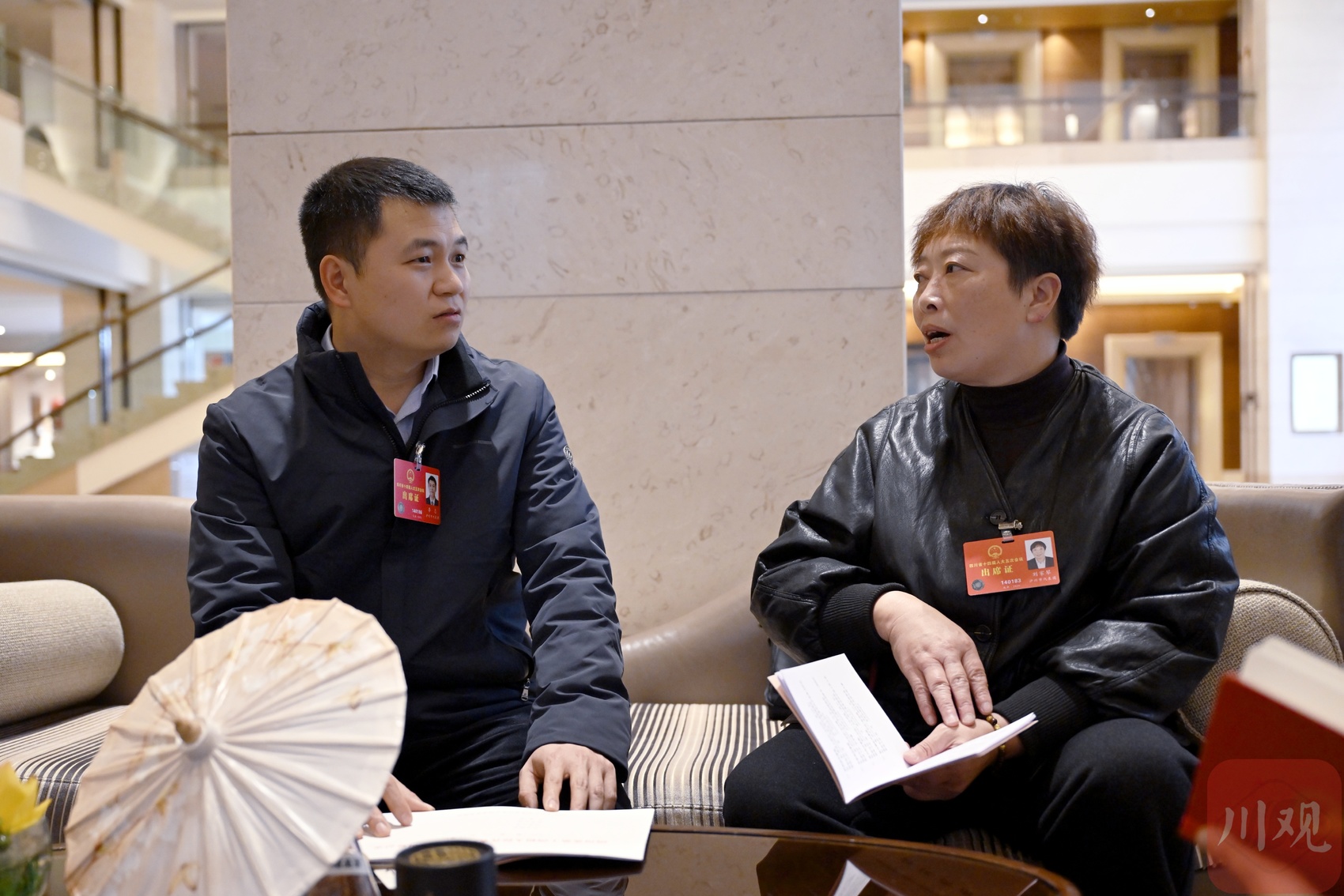 省人大代表李志(左)与刘家琴(右)在一起交流,分享各自关注的领域与履职思考。