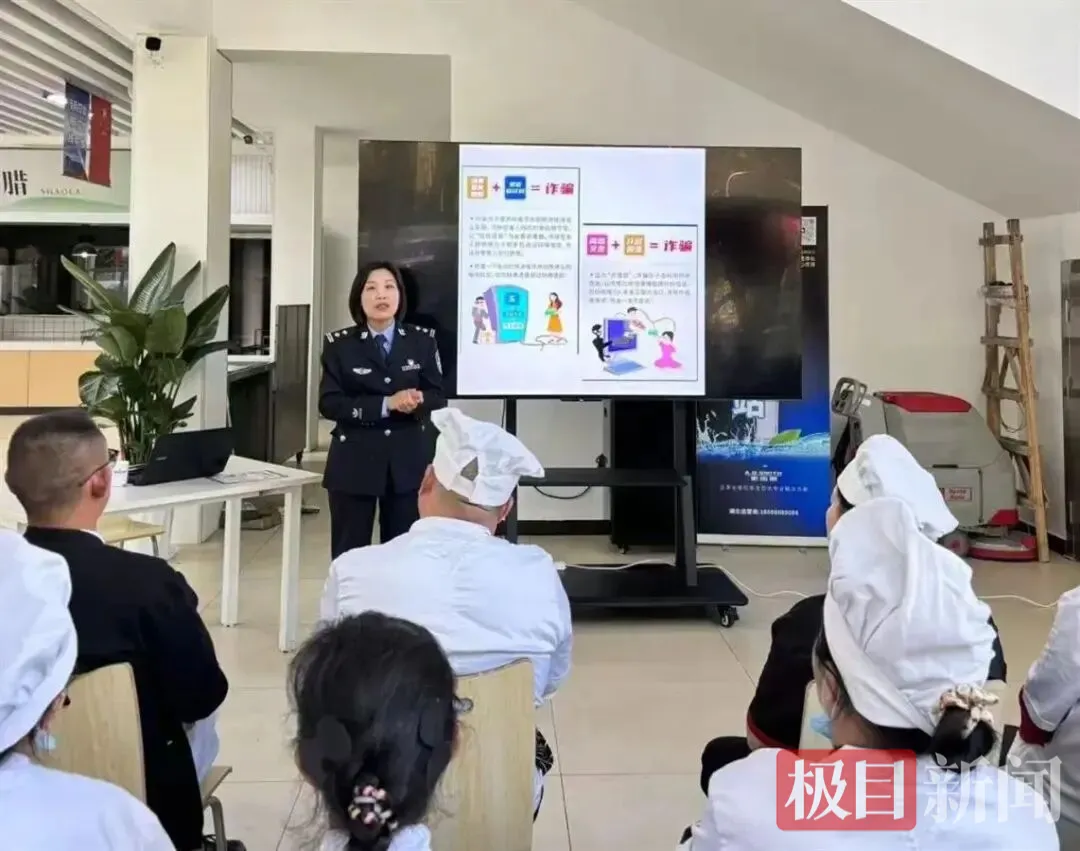 海工社区有近2万名居民,守护居民的“钱袋子”是邵楠的一项重要职责。为此,她采取了多种措施,提升居民的反诈意识。社区警务室的宣传栏每周都会更新电信诈骗警情提示,门口的移动电视和便民充电宝机也在播放反诈宣传短视频。邵楠还和社区网格员一起,制作反诈宣传PPT,编排反诈小品,甚至编写反诈顺口溜,通过轻松愉快的方式,将反诈知识植入居民的脑海中。