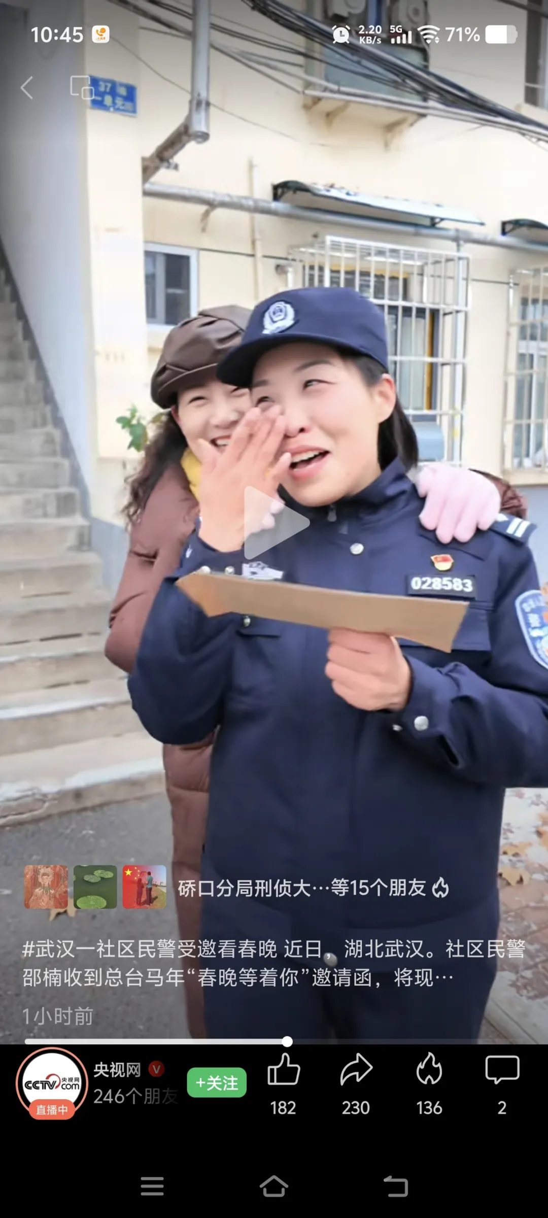 央视视频中,是社区送来的邀请函。听到这一消息后,女警邵楠激动地抱着社区工作人员哭了。居民们纷纷喊话:“太好了,支持邵警官!”