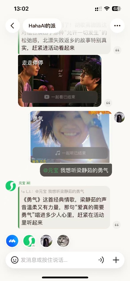 “一起听”功能 则随时可将元宝派变为一个在线音乐派对。朋友们聊天间隙,随时可以@元宝点播一首符合当下心情的歌曲,作为聊天的背景音,或直接成为话题中心。音乐切换完全由派友共同决定,人人都可以是DJ,共同营造专属的听觉氛围。