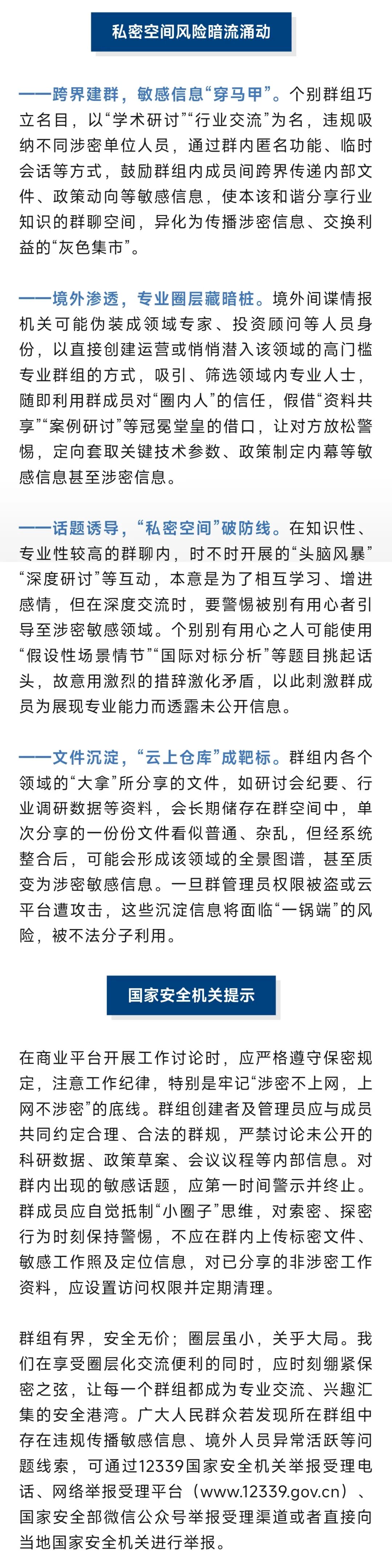 今天,我们的知识获取与交流方式正经历深刻变革。从资深程序员的代码仓库,到学术前沿的线上沙龙,再到手工艺人的心得群组,各类社交平台上的“圈子”,正成为信息时代的新型知识集散地,以“群聊”“小组”为社群的载体搭建起了行业交流的快速通道。但若失去必要边界,这些看似私密的“小包间”,可能成为威胁国家安全的泄密温床。