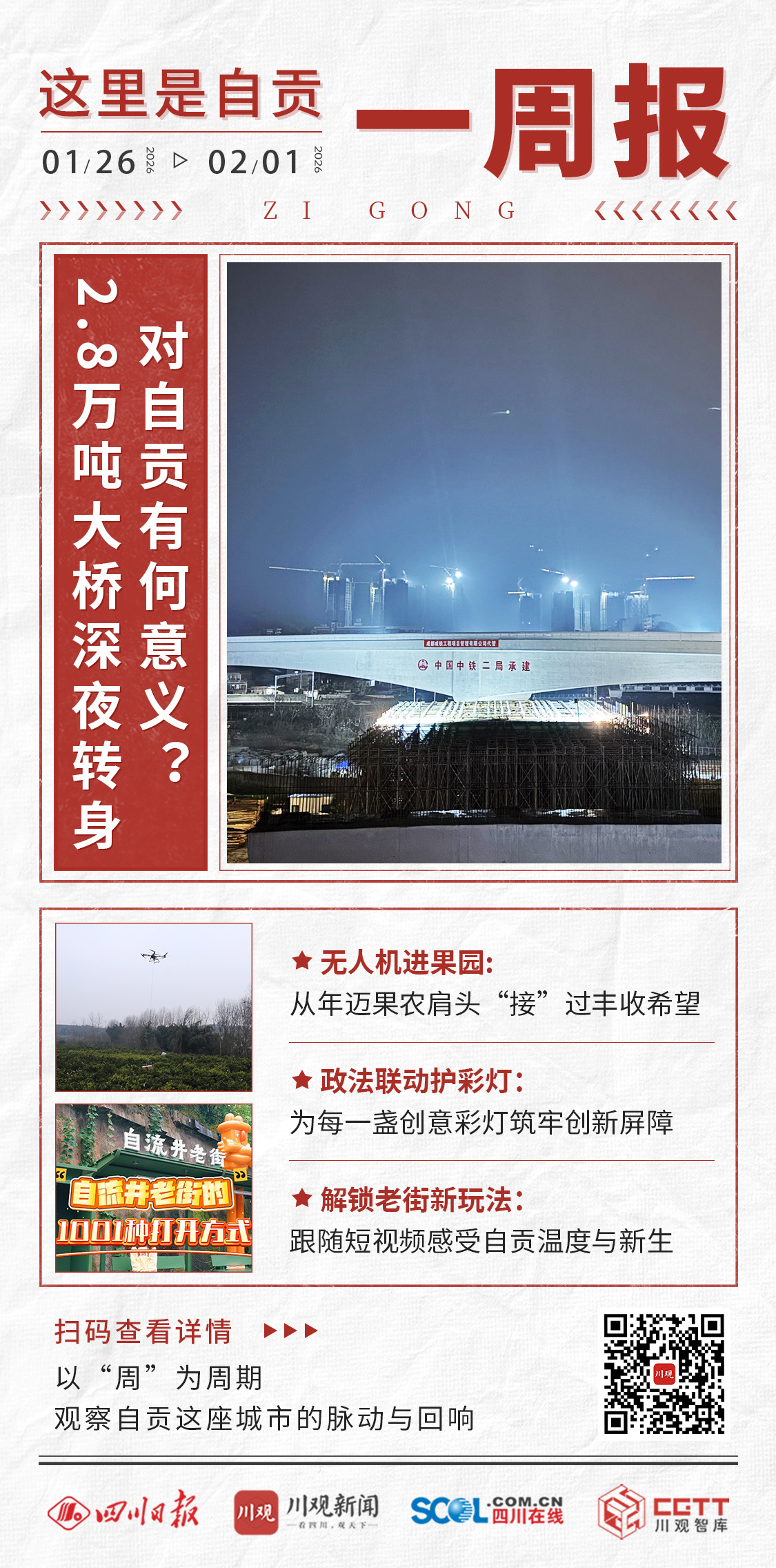 大桥转体、无人机助农、制度护航、老街焕新,它们共同勾勒出一幅新旧交融的城市奋进图景——自贡正在务实创新中不断突破,在守护根脉中温暖前行。