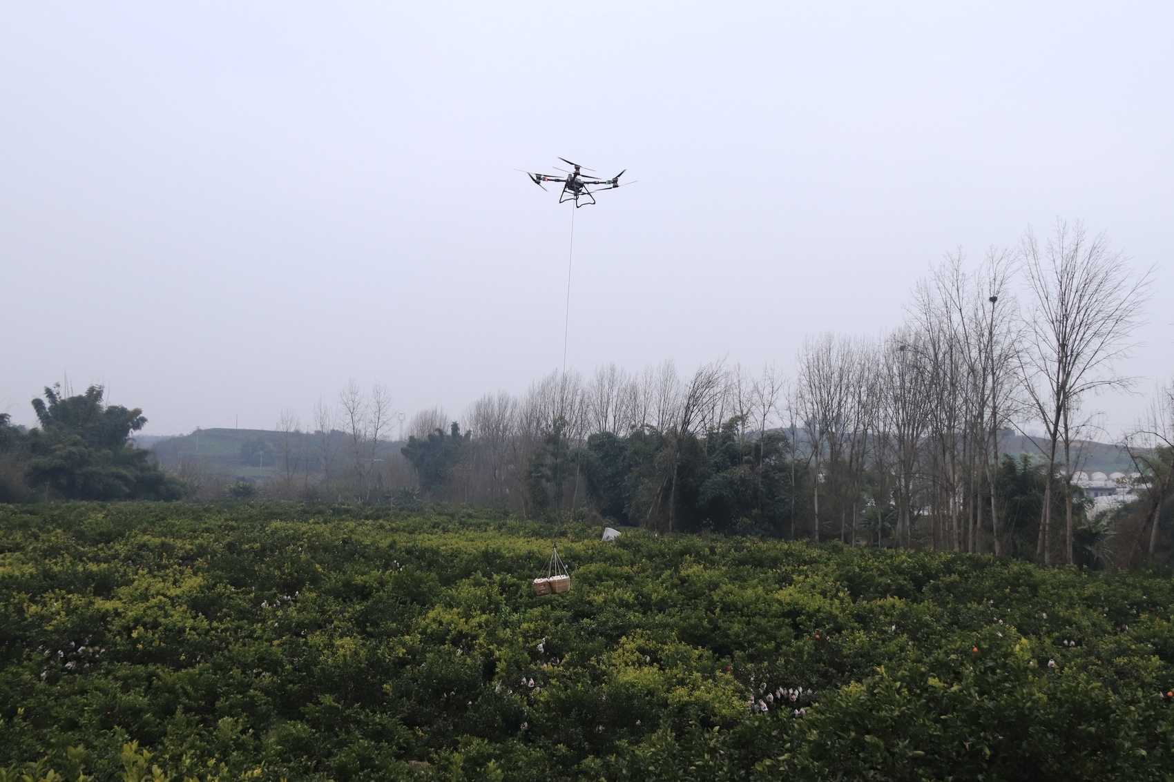 在果园里,大型农用无人机频繁起降,引擎轰鸣、桨叶呼啸间,便将村民们刚刚摘下的满筐柑橘吊运至集装点。