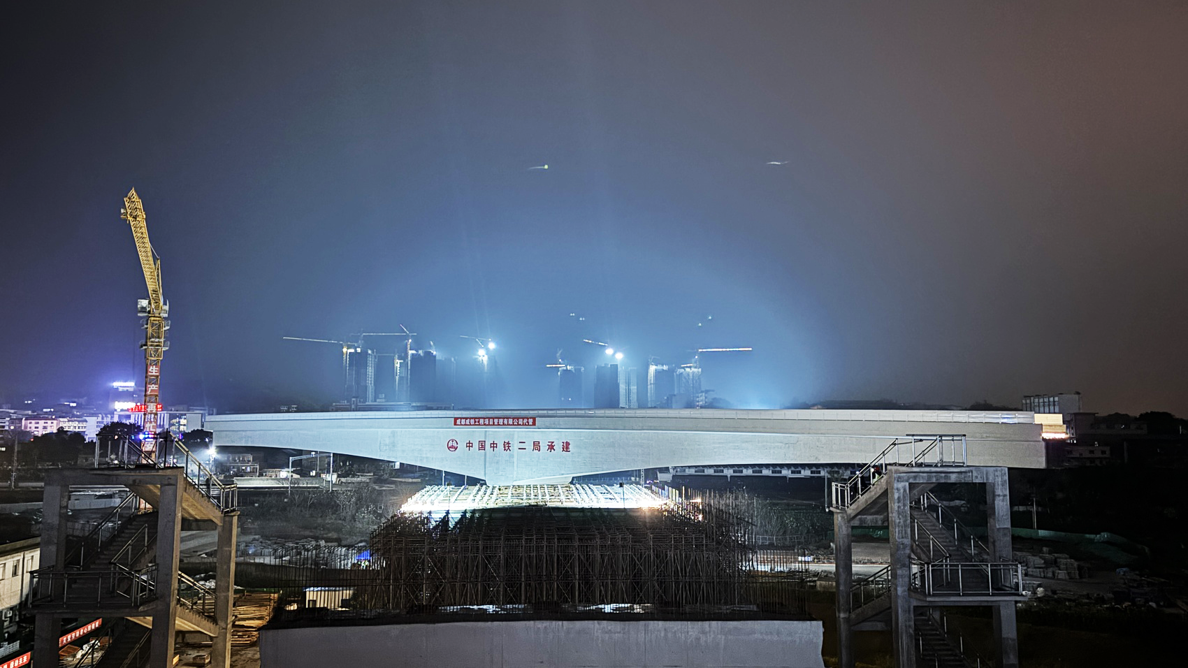 1月29日22点整,在西南(自贡)国际陆港的核心区域,自贡国家骨干冷链物流基地公铁联运基础设施工程关键的节点——跨内昆铁路转体桥,以一场“毫米级”转身宣告成功。