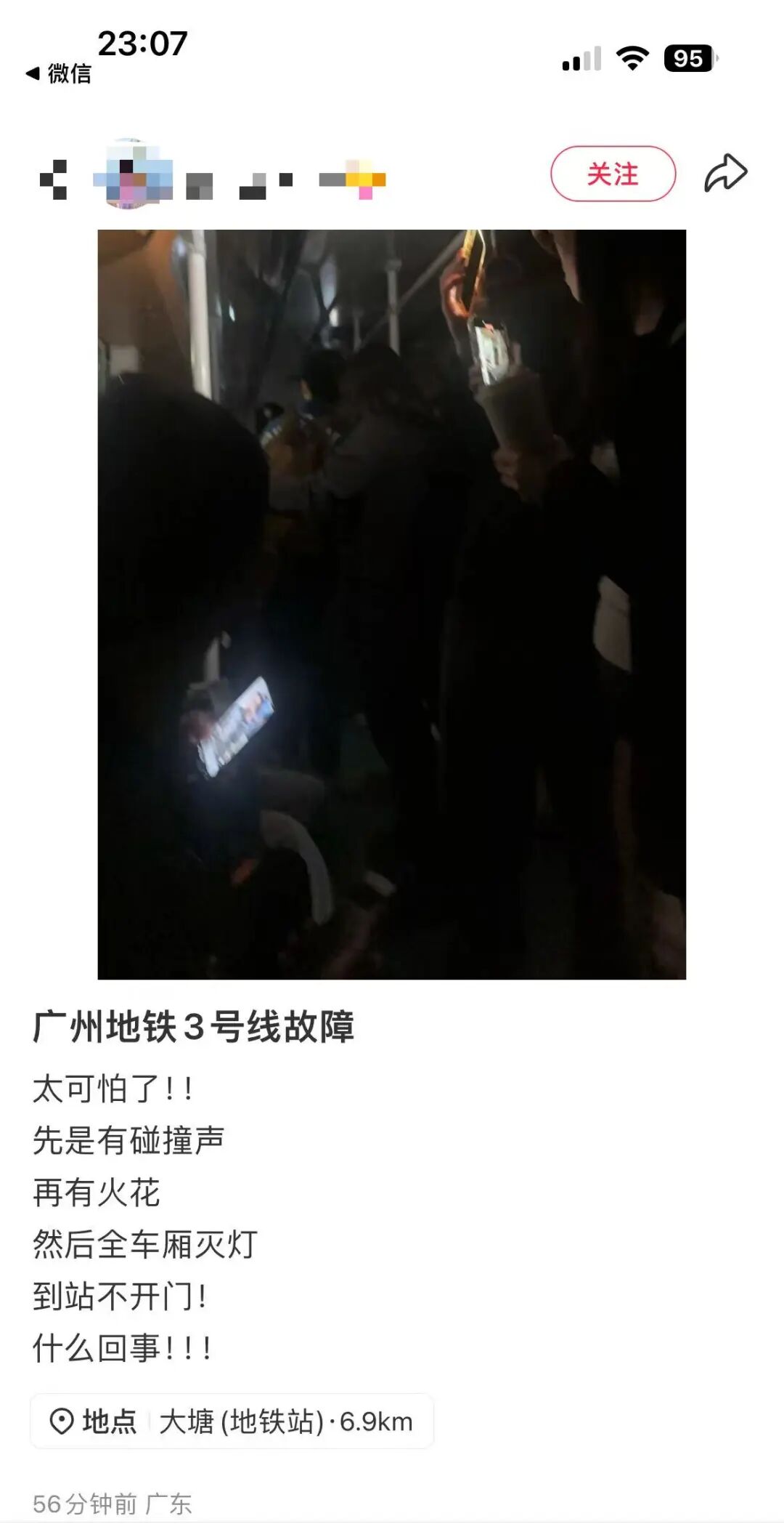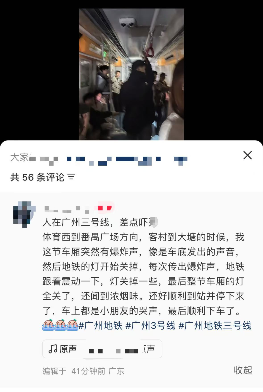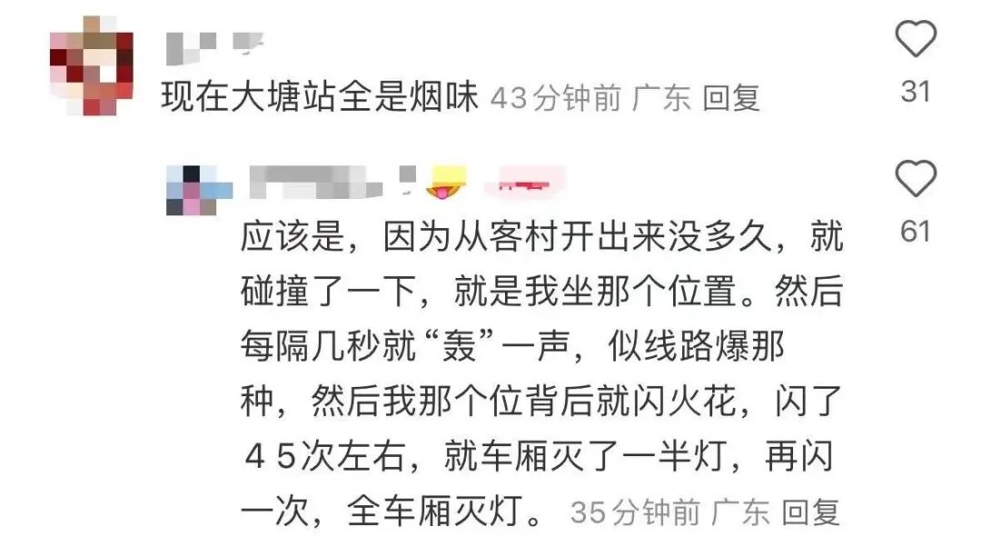 有网友发文描述亲历过程:太可怕了,先是有碰撞声,再有火花,然后全车厢灭灯,到站不开门。帖子定位显示其在三号线大塘站,配图显示列车车厢内灭灯。