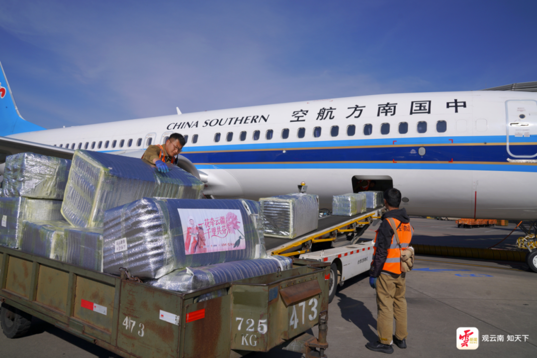 2月1日17时许,昆明长水国际机场,伴随着轰鸣声,南航CZ6950航班冲上云霄,带着1.3万枝云南鲜花飞往新疆,为新疆朋友送去来自云南的祝福。