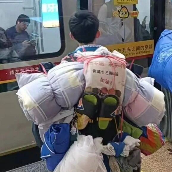 1月30日,广州中小学迎来寒假。在地铁7号线长洲站,有市民拍到一名学生独自背着鼓鼓囊囊的行李候车,被褥、蚊帐、运动鞋、拖鞋等层层叠叠,甚至还有一只被行李完全包围住的“大湾鸡”。这名“小孩哥”的背影几乎被身上堆成小山的行李吞没,背包带也深陷进他的肩膀。