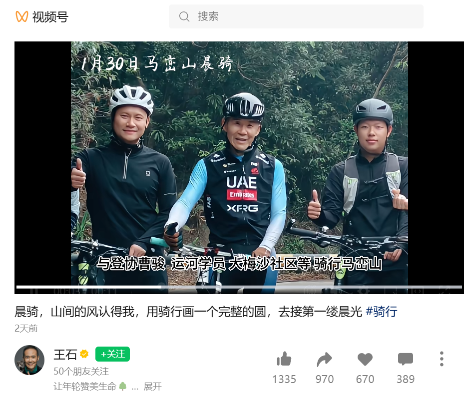 1月30日,王石通过个人朋友圈、视频账号发布当日行程动态,疑似对失联传闻做出回应。其发布的骑行视频标注时间为1月30日,地点为深圳马峦山,当日骑行里程14.44公里,用时约两小时。