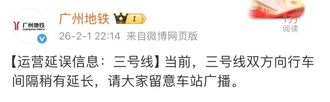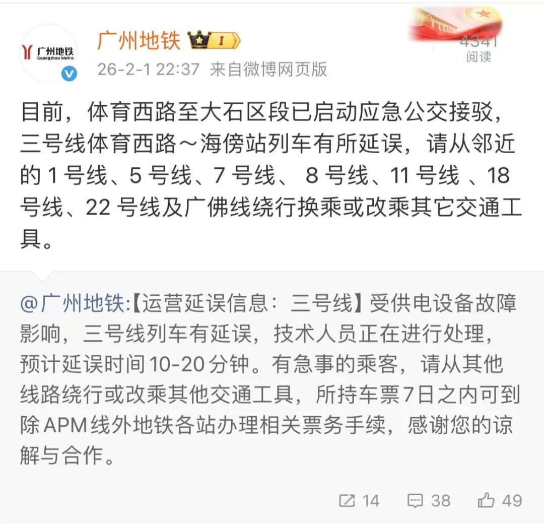 当晚22时14分,@广州地铁 连发3条通报。通报称,三号线双方向行车间隔稍有延长,请大家留意车站广播。