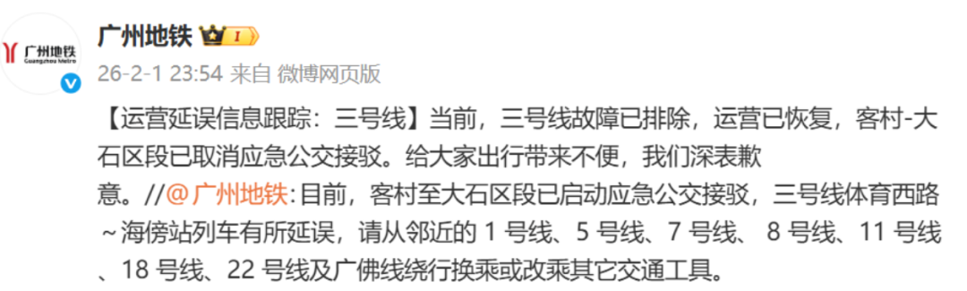 23时54分,广州地铁发布最新通告:当前,三号线故障已排除,运营已恢复,客村-大石区段已取消应急公交接驳。给大家出行带来不便,我们深表歉意。