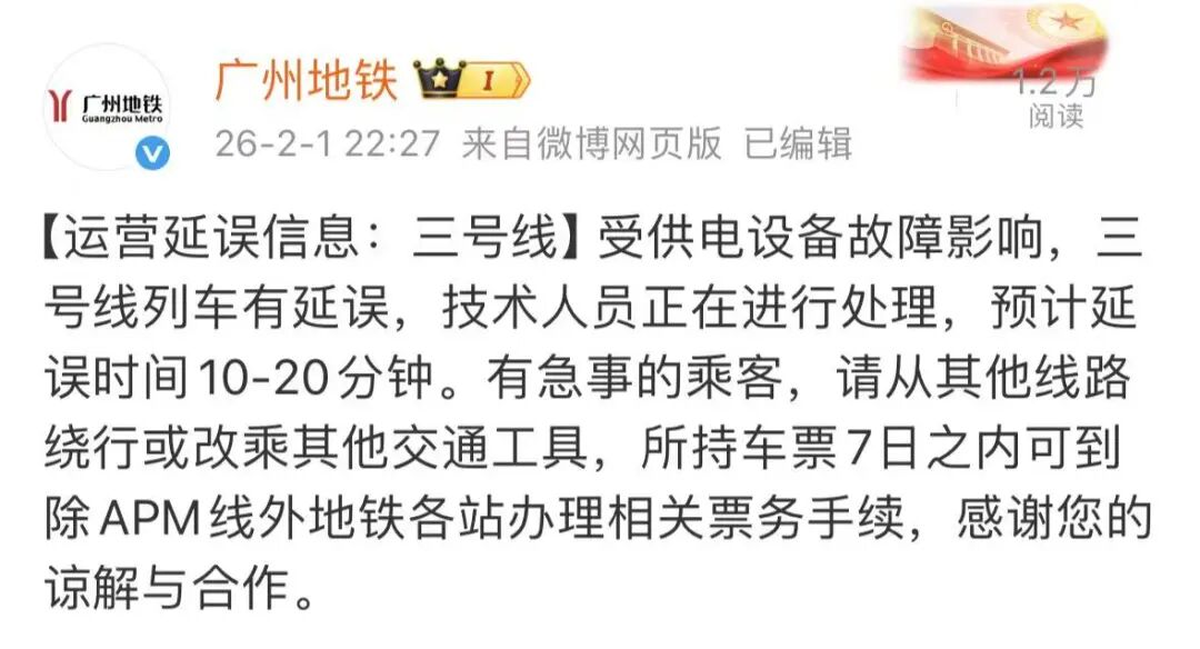 受供电设备故障影响,三号线列车有延误,技术人员正在进行处理,预计延误时间10-20分钟。有急事的乘客,请从其他线路绕行或改乘其他交通工具,所持车票7日之内可到除APM线外地铁各站办理相关票务手续。