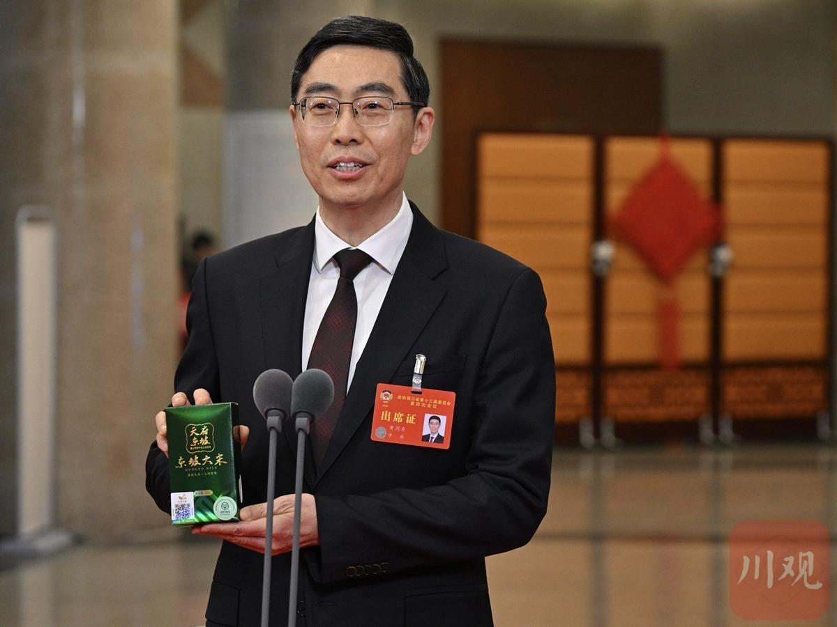 回答问题时,黄剑东从文件袋里掏出了一袋小包装大米。“我这次专门带来了我们眉山的东坡大米,和大家分享。”他展示着手中的大米,“大家看,它颗粒饱满、晶莹如玉、口感很好,是绿色食品,今年还将取得有机认证。”