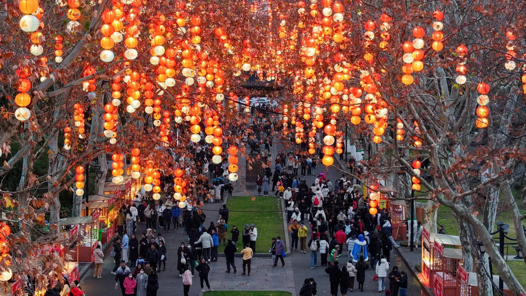 在城隍庙,大红灯笼高高挂起,对联摆件琳琅满目,人潮间,炒货的香混着店家的吆喝钻进市井巷弄,儿时的年,又回来了。
