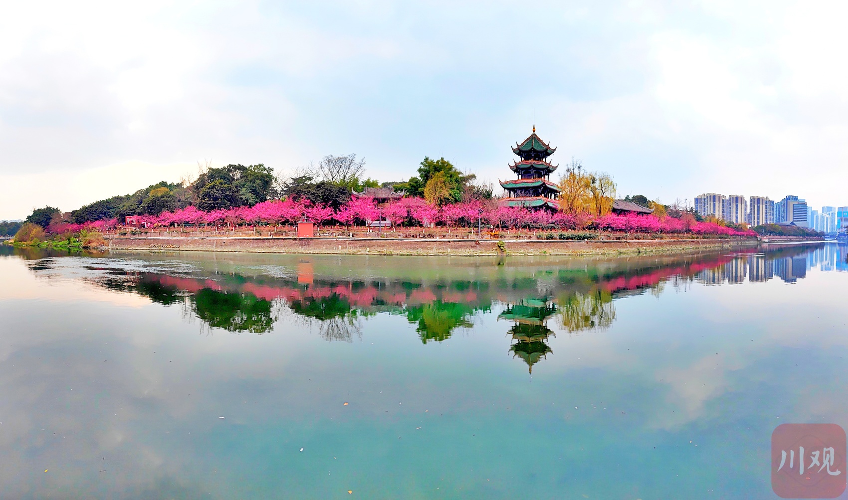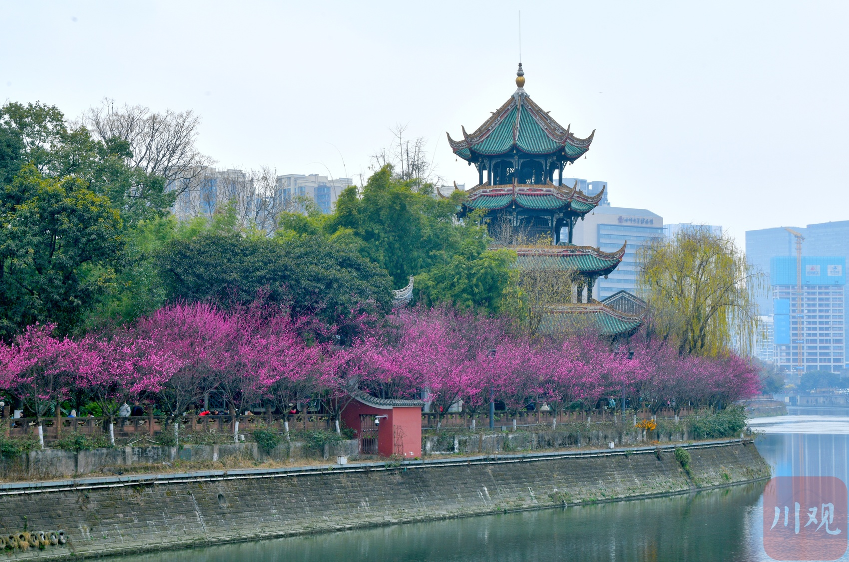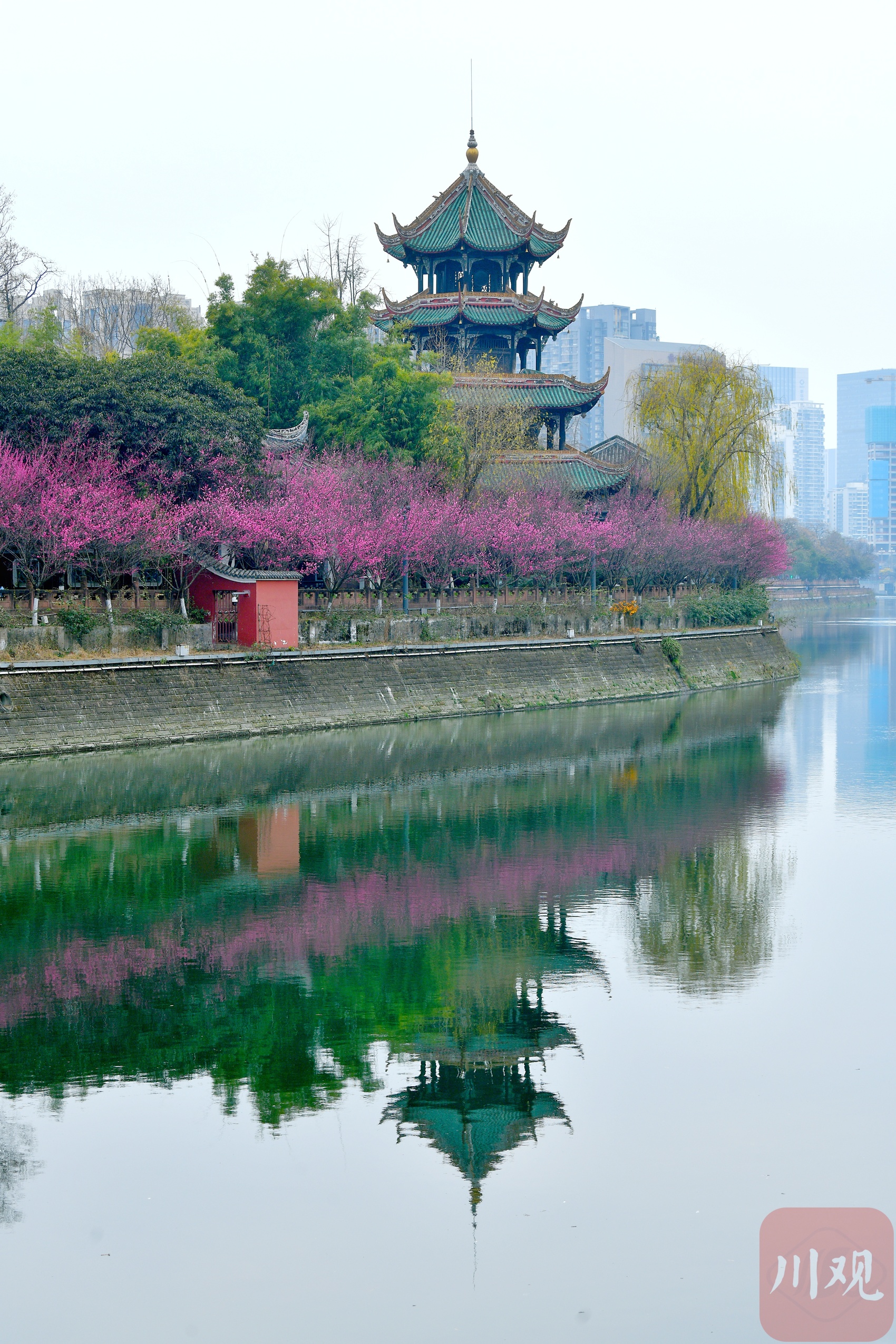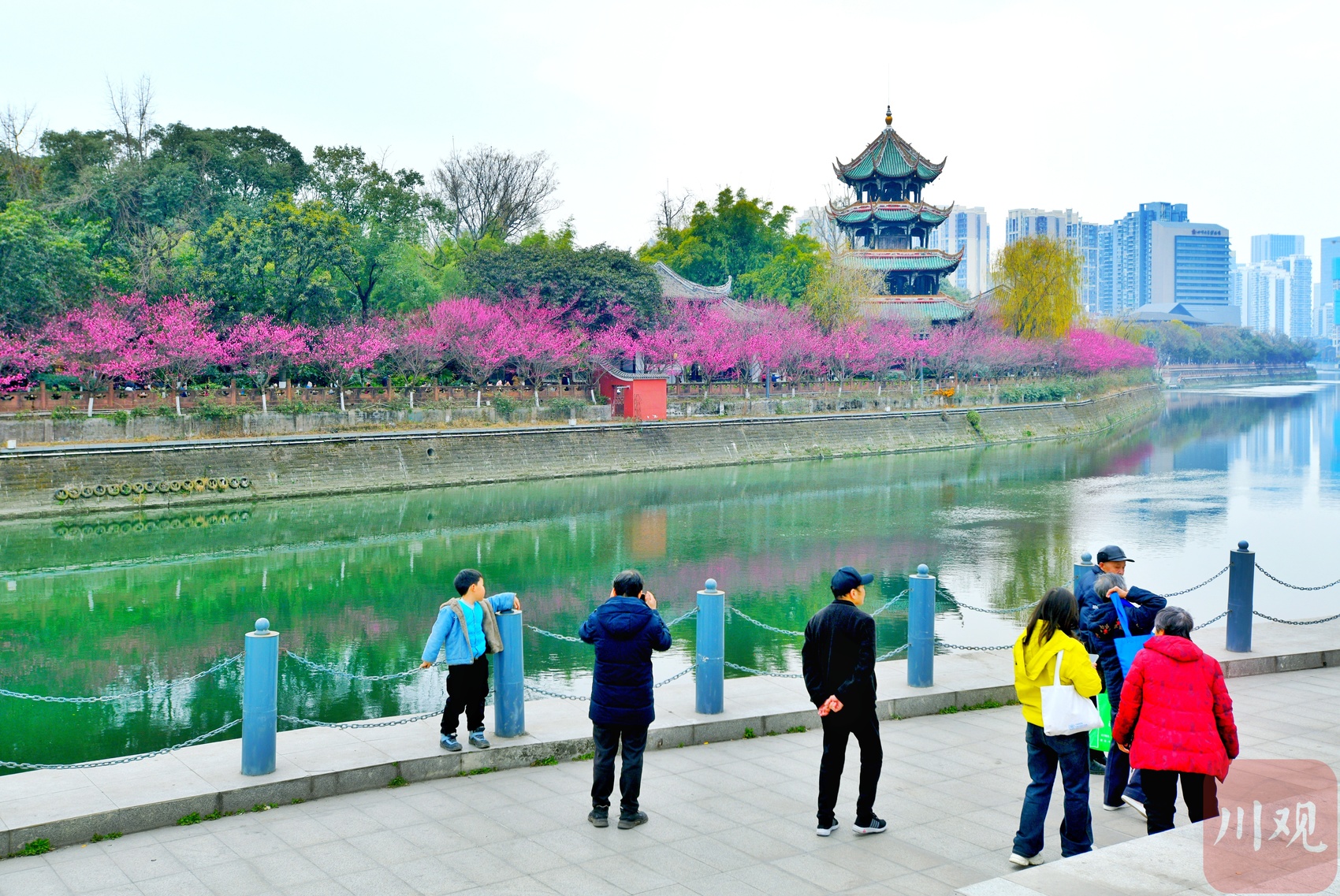 2月1日,成都锦江边望江楼下,红梅迎来盛花期,粉红花瓣缀满枝头,与崇丽阁相映成趣,倒映在澄澈的锦江水中,构成一幅兼具古韵与生机的冬日画卷。不仅吸引过往市民和游客驻足打卡,还成为寒冬里最动人的一道风景线。有市民表示,站在锦江边以红梅、崇丽阁倒影为背景拍照留念,是成都拿得出手的地标打卡点。