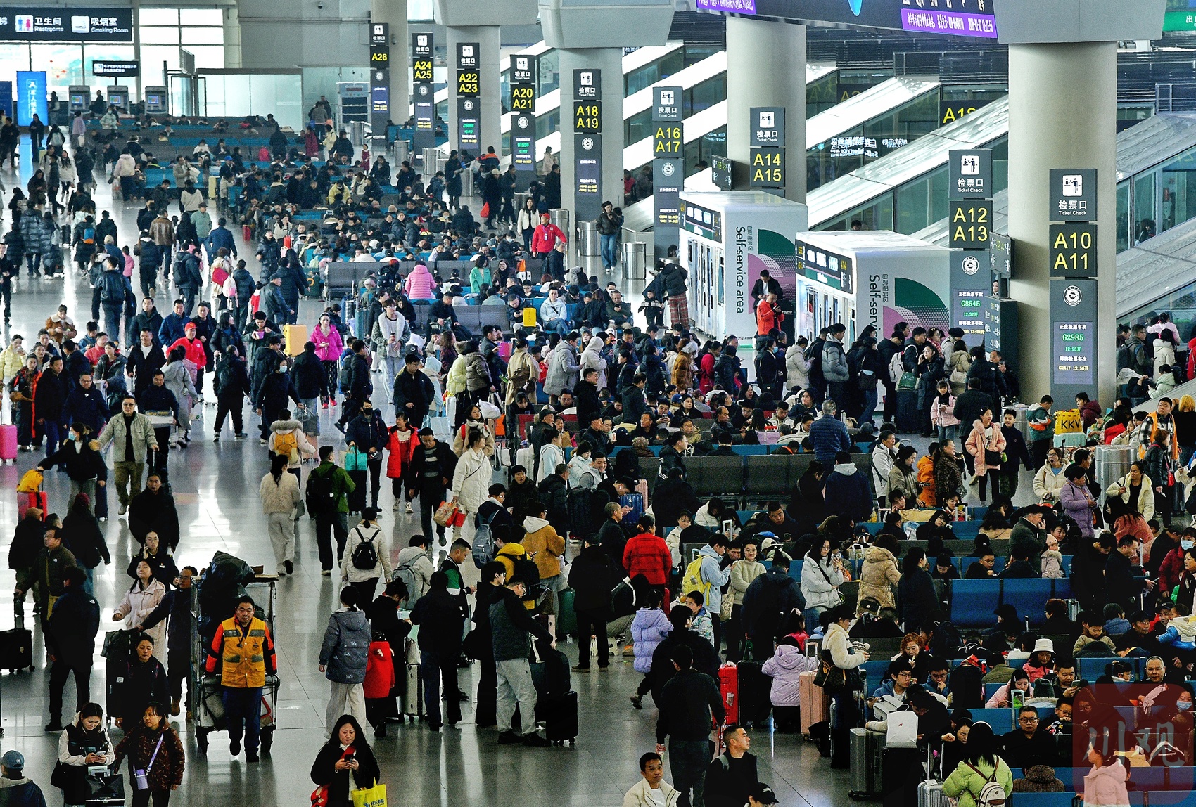 成都东站候车厅里的旅客。
